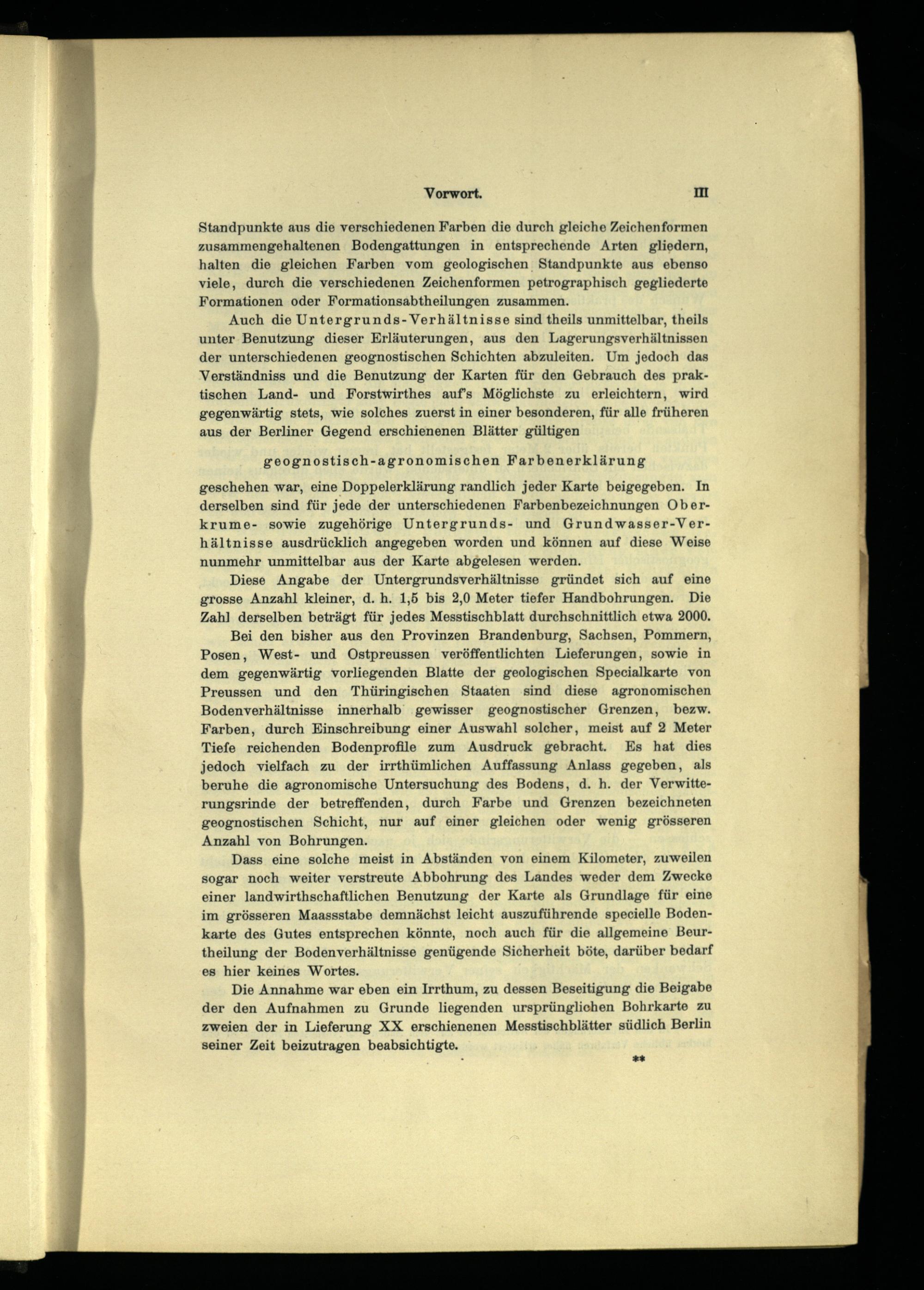 Bei den bisher aus den Provinzen Brandenburg , Sachsen , Pommern , Posen, West- und Ostpreussen veröffentlichten Lieferungen, sowie in dem gegenwärtig vorliegenden Blatte der geologischen Specialkarte von Preussen und den Thüringischen Staaten sind diese agronomischen Bodenverhältnisse innerhalb gewisser geognostischer Grenzen, bezw. Farben, durch Einschreibung einer Auswahl solcher, meist auf 2 Meter Tiefe reichenden Bodenprofile zum Ausdruck gebracht. Es hat dies jedoch vielfach zu der irrthümlichen Auffassung Anlass gegeben, als beruhe die agronomische Untersuchung des Bodens, d. h. der Verwitterungsrinde der betreffenden, durch Farbe und Grenzen bezeichneten geognostischen Schicht, nur auf einer gleichen oder wenig grösseren Anzahl von Bohrungen.
