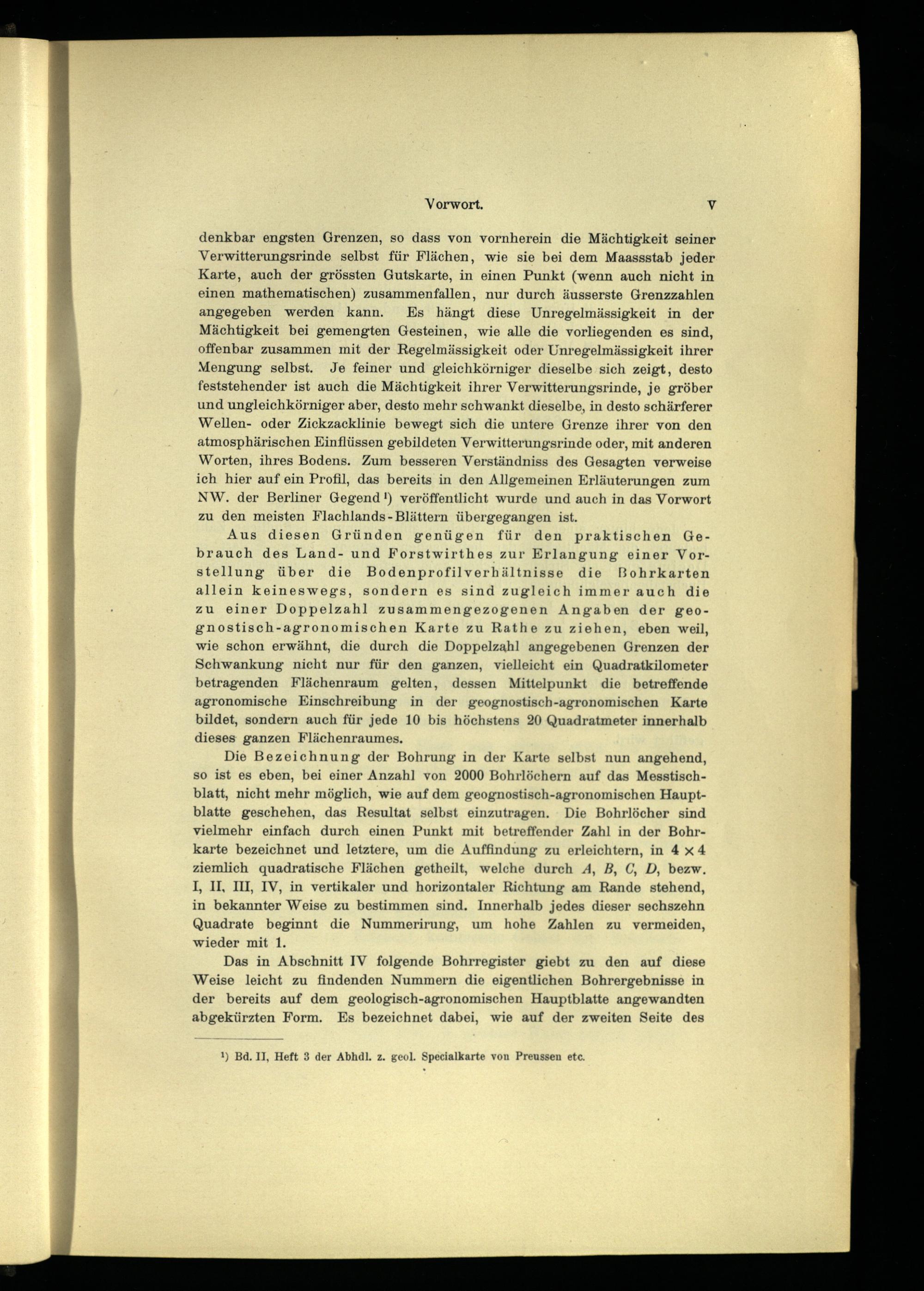 denkbar engsten Grenzen, so dass von vornherein die Mächtigkeit seiner Verwitterungsrinde selbst für Flächen, wie sie bei dem Maassstab jeder Karte, auch der grössten Gutskarte, in einen Punkt(wenn auch nicht in einen mathematischen) zusammenfallen, nur durch äusserste Grenzzahlen angegeben werden kann. Es hängt diese Unregelmässigkeit in der Mächtigkeit bei gemengten Gesteinen, wie alle die vorliegenden es sind, offenbar zusammen mit der Regelmässigkeit oder Unregelmässigkeit ihrer Mengung selbst. Je feiner und gleichkörniger dieselbe sich zeigt, desto feststehender ist auch die Mächtigkeit ihrer Verwitterungsrinde, je gröber und ungleichkörniger aber, desto mehr schwankt dieselbe, in desto schärferer Wellen- oder Zickzacklinie bewegt sich die untere Grenze ihrer von den atmosphärischen Einflüssen gebildeten Verwitterungsrinde oder, mit anderen Worten, ihres Bodens. Zum besseren Verständniss des Gesagten verweise ich hier auf ein Profil, das bereits in den Allgemeinen Erläuterungen zum NW. der Berliner Gegend!) veröffentlicht wurde und auch in das Vorwort zu den meisten Flachlands- Blättern übergegangen ist.