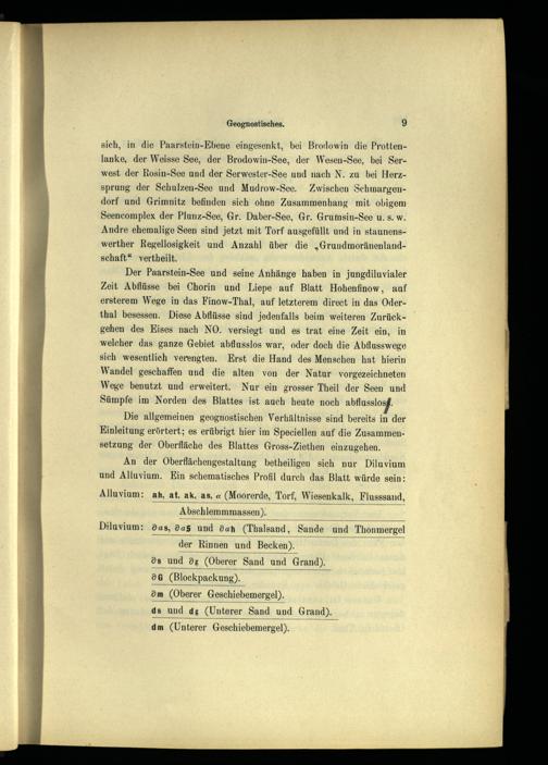 sich, in die Paarstein-Ebene eingesenkt, bei Brodowin die Prottenlanke, der Weisse See, der Brodowin-See, der Wesen-See, bei Serwest der Rosin-See und der Serwester-See und nach N. zu bei Herzsprung der Schulzen-See und Mudrow-See. Zwischen Schmargen dorf und Grimnitz befinden sich ohne Zusammenhang mit obigem Seencomplex der Plunz-See, Gr. Daber-See, Gr. Grumsin-See u. s. w. Andre ehemalige Seen sind jetzt mit Torf ausgefüllt und in staunenswerther Regellosigkeit und Anzahl über die„Grundmoränenland schaft “ vertheilt.