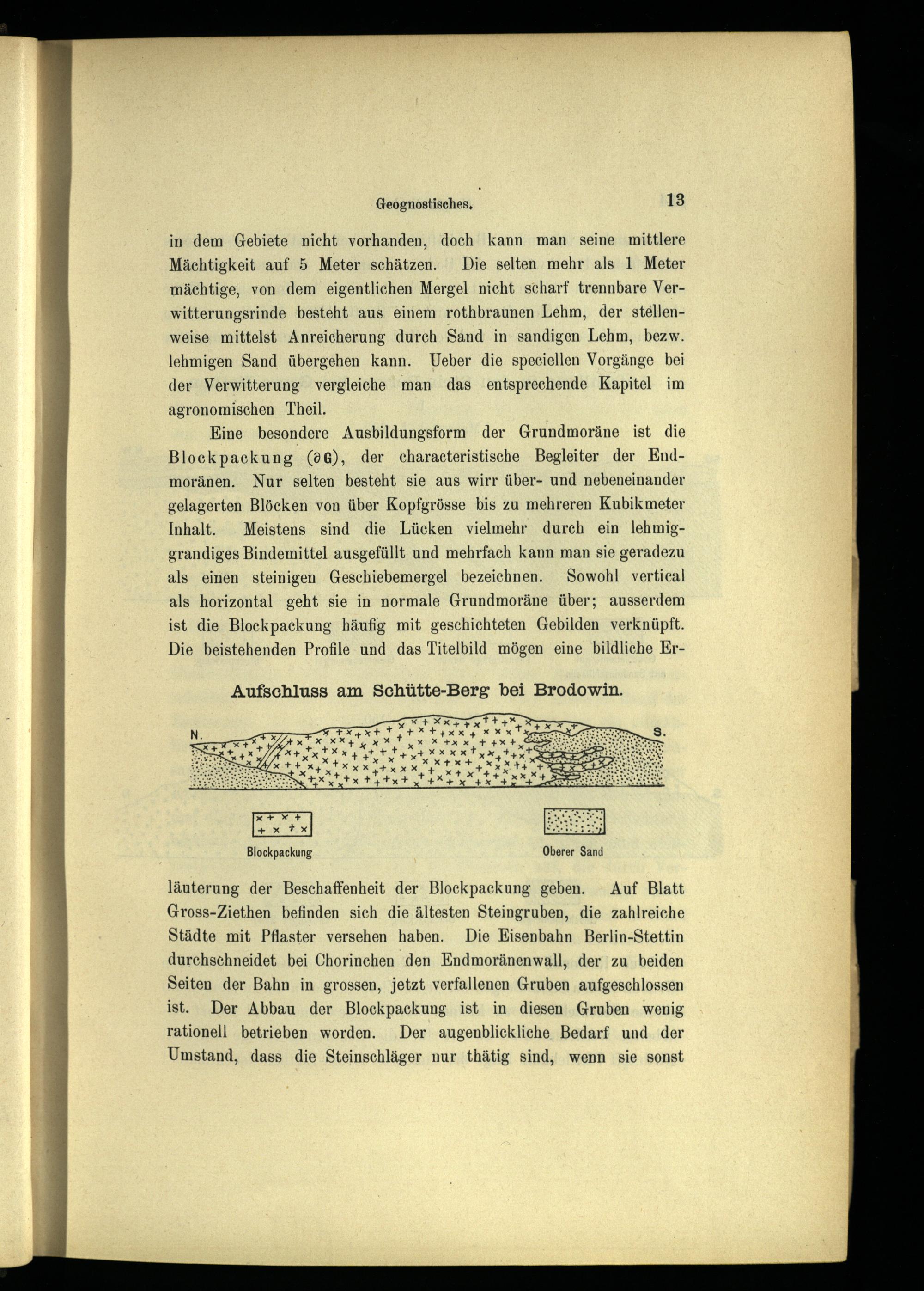 läuterung der Beschaffenheit der Blockpackung geben. Auf Blatt Gross-Ziethen befinden sich die ältesten Steingruben, die zahlreiche Städte mit Pflaster versehen haben. Die Eisenbahn Berlin-Stettin durchschneidet bei Chorinchen den Endmoränenwall, der zu beiden Seiten der Bahn in grossen, jetzt verfallenen Gruben aufgeschlossen ist. Der Abbau der Blockpackung ist in diesen Gruben wenig rationell betrieben worden. Der augenblickliche Bedarf und der Umstand, dass die Steinschläger nur thätig sind, wenn sie sonst