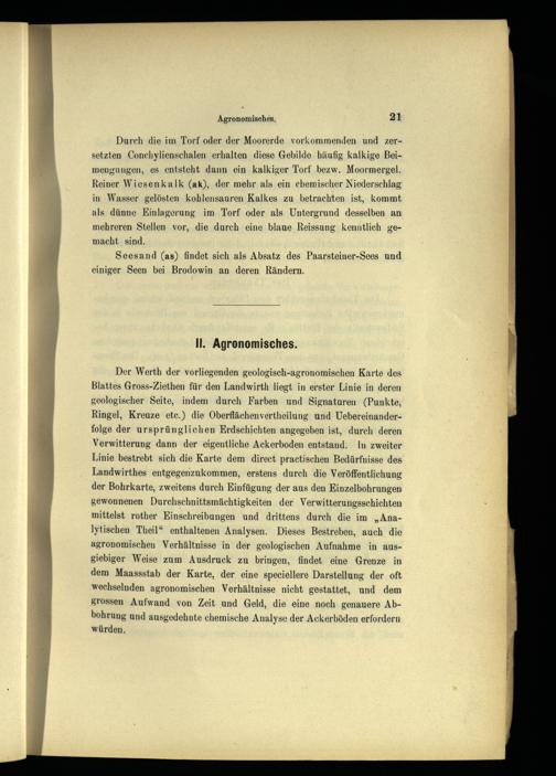 Der Werth der vorliegenden geologisch-agronomischen Karte des Blattes Gross-Ziethen für den Landwirth liegt in erster Linie in deren geologischer Seite, indem durch Farben und Signaturen(Punkte, Ringel, Kreuze etc.) die Oberflächenvertheilung und Uebereinanderfolge der ursprünglichen Erdschichten angegeben ist, durch deren Verwitterung dann der eigentliche Ackerboden entstand. In zweiter Linie bestrebt sich die Karte dem direct praetischen Bedürfnisse des Landwirthes entgegenzukommen, erstens durch die Veröffentlichung der Bohrkarte, zweitens durch Einfügung der aus den Einzelbohrungen gewonnenen Durchschnittsmächtigkeiten der Verwitterungsschichten mittelst rother Einschreibungen und drittens durch die im„Analytischen Theil“ enthaltenen Analysen. Dieses Bestreben, auch die agronomischen Verhältnisse in der geologischen Aufnahme in ausgiebiger Weise zum Ausdruck zu bringen, findet eine Grenze in dem Maassstab der Karte, der eine speciellere Darstellung der oft wechselnden agronomischen Verhältnisse nicht gestattet, und dem grossen Aufwand von Zeit und Geld, die eine noch genauere Ab