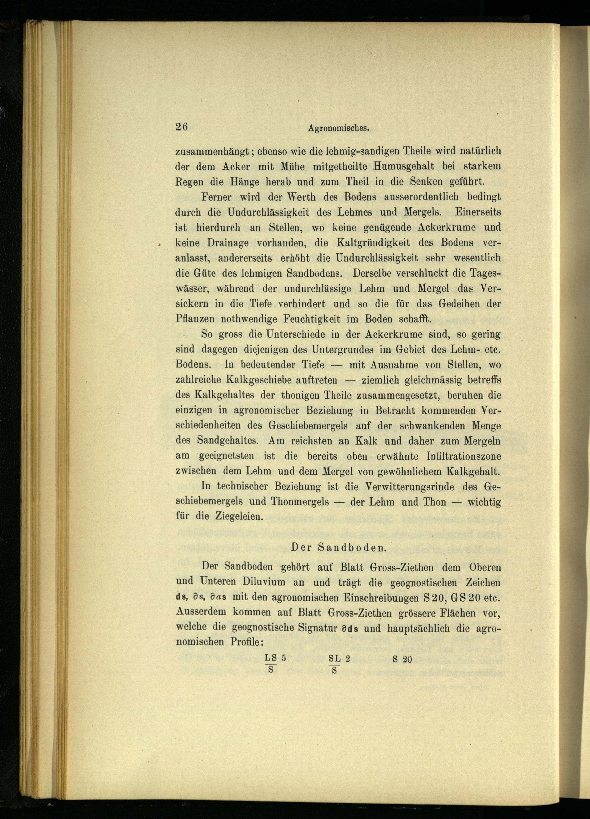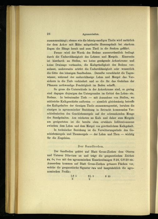 Der Sandboden gehört auf Blatt Gross-Ziethen dem Oberen und Unteren Diluvium an und trägt die geognostischen Zeichen ds, ös, das mit den agronomischen Einschreibungen S20, GS20 ete. Ausserdem kommen auf Blatt Gross-Ziethen grössere Flächen vor, welche die geognostische Signatur dds und hauptsächlich die agronomischen Profile: