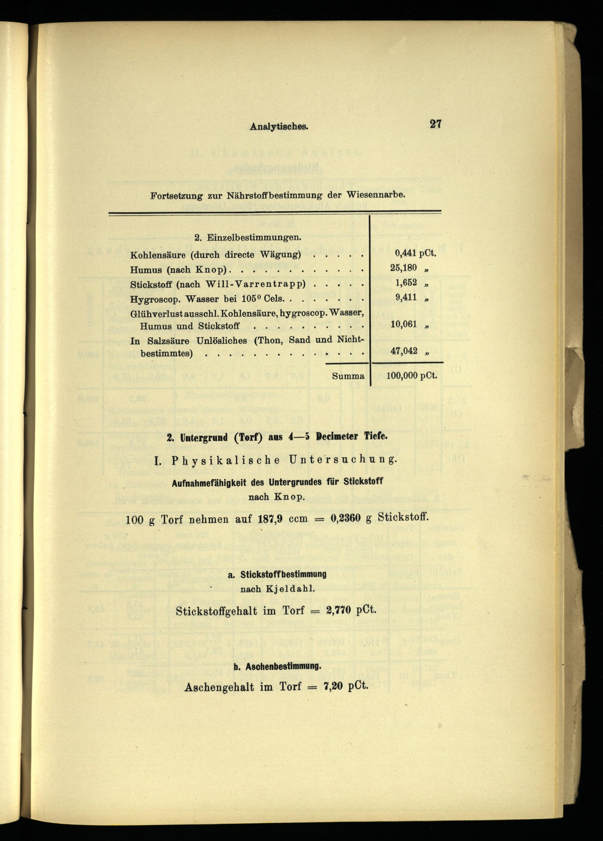2, Einzelbestimmungen. Kohlensäure(durch directe Wägung).... 0,441 pCt. Humus(nach Knop).....- RR 25,180„ Stickstoff(nach Will- N Varronirapp).. wii 1,652 Hygroscop. Wasser bei 105° Cels......+ 9,411: