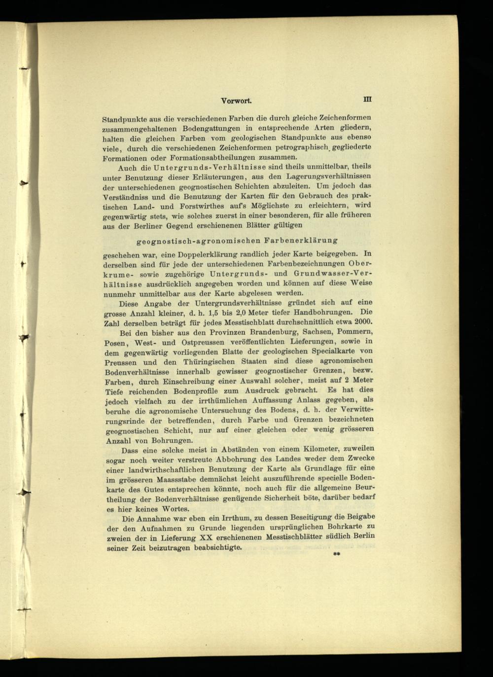 Bei den bisher aus den Provinzen Brandenburg , Sachsen , Pommern , Posen, West- und Ostpreussen veröffentlichten Lieferungen, sowie in dem gegenwärtig vorliegenden Blatte der geologischen Specialkarte von Preussen und den Thüringischen Staaten sind diese agronomischen Bodenverhältnisse innerhalb gewisser geognostischer Grenzen, bezw. Farben, durch Einschreibung einer Auswahl solcher, meist auf 2 Meter Tiefe reichenden Bodenprofile zum Ausdruck gebracht. Es hat dies jedoch vielfach zu der irrthümlichen Auffassung Anlass gegeben, als beruhe die agronomische Untersuchung des Bodens, d. h. der Verwitterungsrinde der betreffenden, durch Farbe und Grenzen bezeichneten geognostischen Schicht, nur auf einer gleichen oder wenig grösseren Anzahl von Bohrungen.