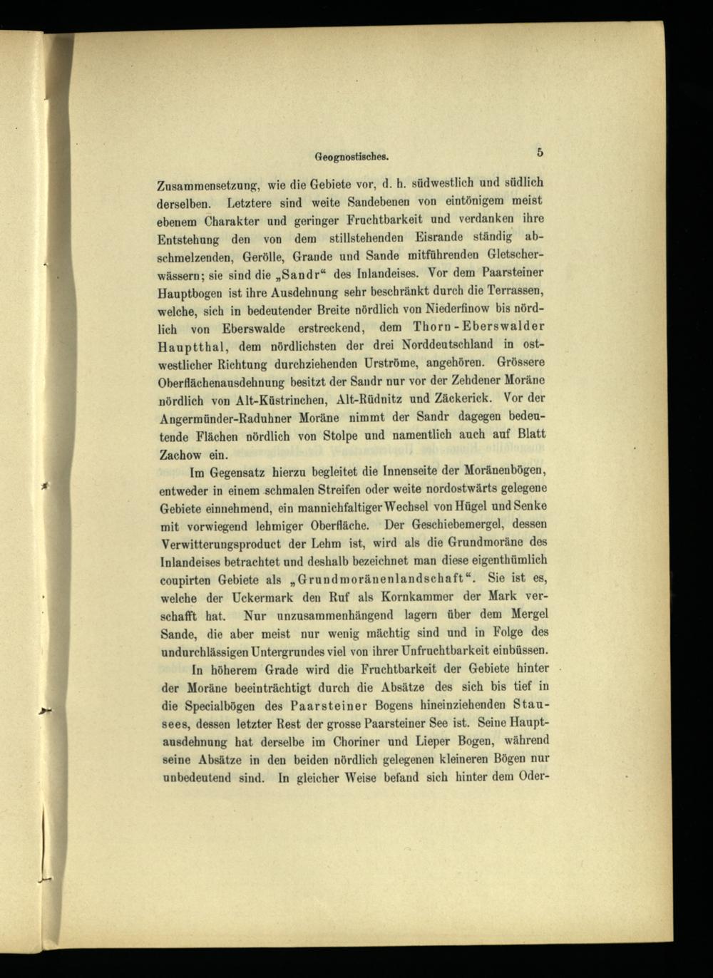 Zusammensetzung, wie die Gebiete vor, d. h. südwestlich und südlich derselben. Letztere sind weite Sandebenen von eintönigem meist ebenem Charakter und geringer Fruchtbarkeit und verdanken ihre Entstehung den von dem stillstehenden Eisrande ständig abschmelzenden, Gerölle, Grande und Sande mitführenden Gletscherwässern; sie sind die„Sandr“ des Inlandeises. Vor dem Paarsteiner Hauptbogen ist ihre Ausdehnung sehr beschränkt durch die Terrassen, welche, sich in bedeutender Breite nördlich von Niederfinow bis nördlich von Eberswalde erstreckend, dem Thorn-KEberswalder Hauptthal, dem nördlichsten der drei Norddeutschland in ostwestlicher Richtung durchziehenden Urströme, angehören. Grössere Oberflächenausdehnung besitzt der Sandr nur vor der Zehdener Moräne nördlich von Alt-Küstrinchen, Alt-Rüdnitz und Zäckerick . Vor der Angermünder-Raduhner Moräne nimmt der Sandr dagegen bedeutende Flächen nördlich von Stolpe und namentlich auch auf Blatt Zachow ein.
