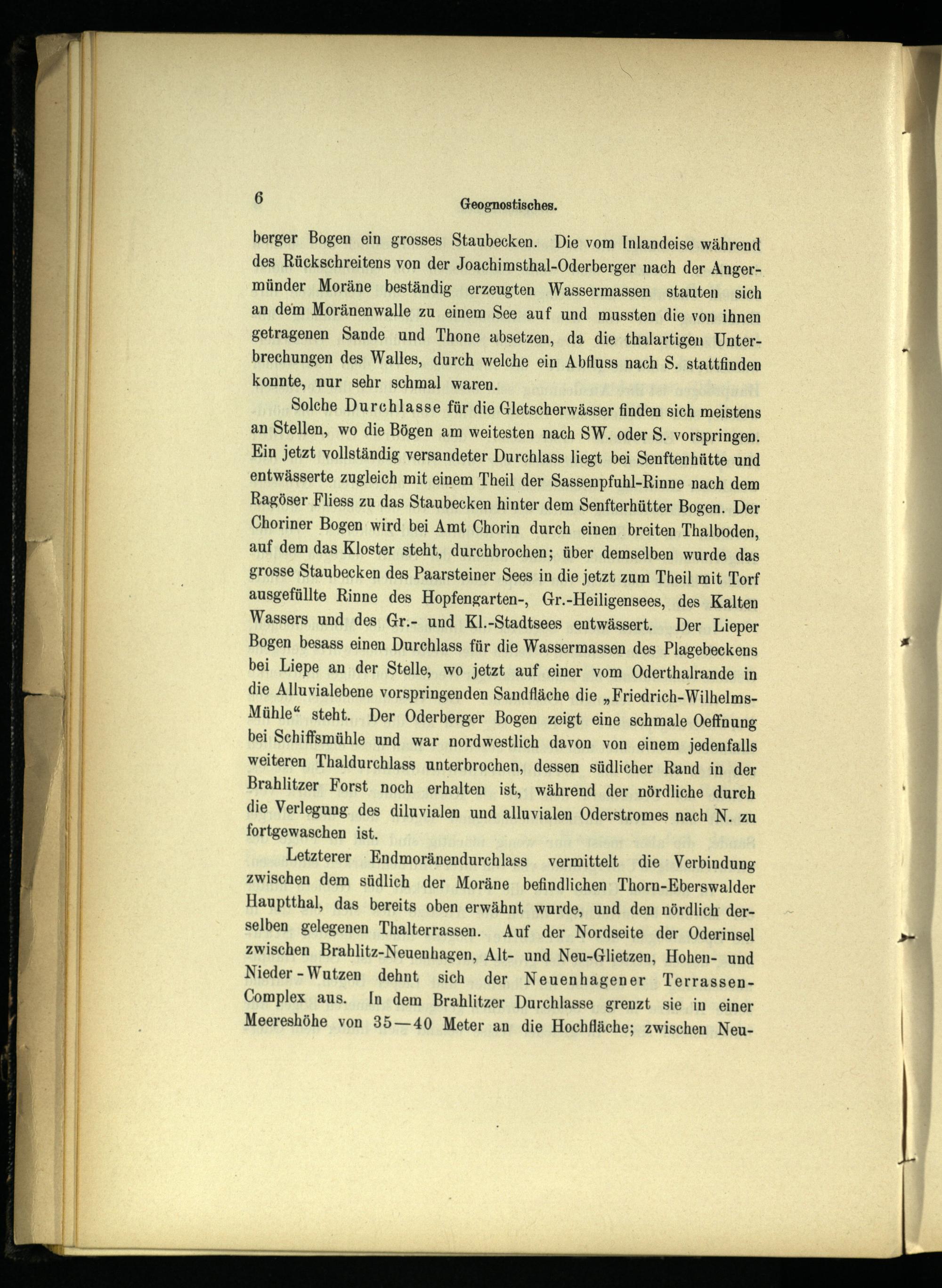 Solche Durchlasse für die Gletscherwässer finden sich meistens an Stellen, wo die Bögen am weitesten nach SW. oder 8. vorspringen. Ein jetzt vollständig versandeter Durchlass liegt bei Senftenhütte und entwässerte zugleich mit einem Theil der Sassenpfuhl-Rinne nach dem Ragöser Fliess zu das Staubecken hinter dem Senfterhütter Bogen. Der Choriner Bogen wird bei Amt Chorin durch einen breiten Thalboden, auf dem das Kloster steht, durchbrochen; über demselben wurde das grosse Staubecken des Paarsteiner Sees in die jetzt zum Theil mit Torf ausgefüllte Rinne des Hopfengarten-, Gr.-Heiligensees, des Kalten Wassers und des Gr.- und Kl.-Stadtsees entwässert. Der Lieper Bogen besass einen Durchlass für die Wassermassen des Plagebeckens bei Liepe an der Stelle, wo jetzt auf einer vom Oderthalrande in die Alluvialebene vorspringenden Sandfläche die„Friedrich-WilhelmsMühle“ steht. Der Oderberger Bogen zeigt eine schmale Oeffnung bei Schiffsmühle und war nordwestlich davon von einem jedenfalls weiteren Thaldurchlass unterbrochen, dessen südlicher Rand in der Brahlitzer Forst noch erhalten ist, während der nördliche durch die Verlegung des diluvialen und alluvialen Oderstromes nach N. zu fortgewaschen ist.