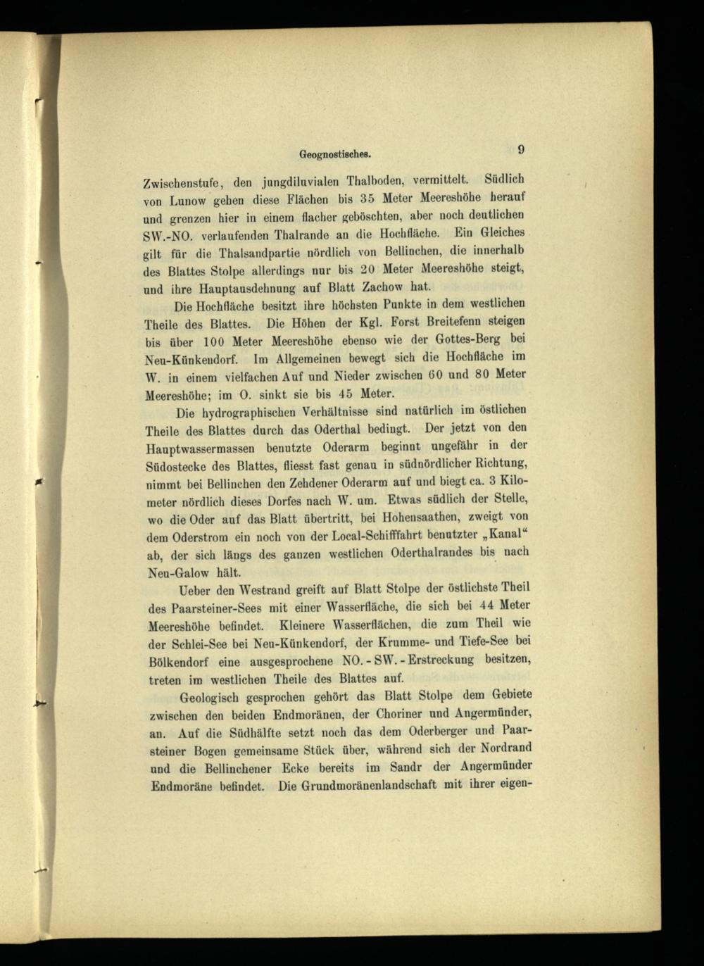Zwischenstufe, den jungdiluvialen Thalboden, vermittelt. Südlich von Lunow gehen diese Flächen bis 35 Meter Meereshöhe herauf und grenzen hier in einem flacher geböschten, aber noch deutlichen SW.-NO. verlaufenden Thalrande an die Hochfläche. Ein Gleiches gilt für die Thalsandpartie nördlich von Bellinchen, die innerhalb des Blattes Stolpe allerdings nur bis 20 Meter Meereshöhe steigt, und ihre Hauptausdehnung auf Blatt Zachow hat.
