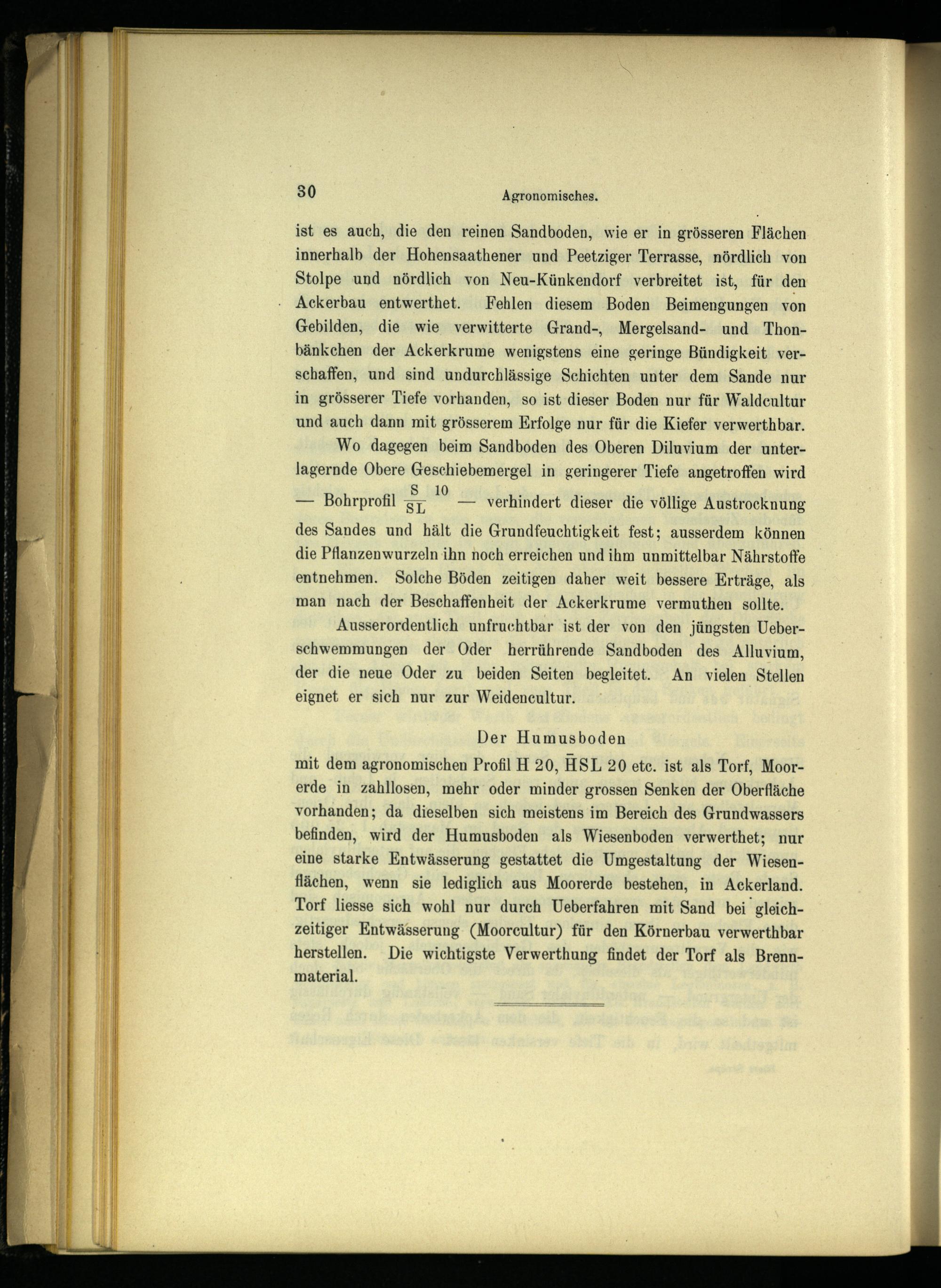 mit dem agronomischen Profil H 20, HSL 20 etc. ist als Torf, Moorerde in zahllosen, mehr oder minder grossen Senken der Oberfläche vorhanden; da dieselben sich meistens im Bereich des Grundwassers befinden, wird der Humusboden als Wiesenboden verwerthet; nur eine starke Entwässerung gestattet die Umgestaltung der Wiesenflächen, wenn sie lediglich aus Moorerde bestehen, in Ackerland. Torf liesse sich wohl nur durch Ueberfahren mit Sand bei gleichzeitiger Entwässerung(Moorcultur) für den Körnerbau verwerthbar herstellen. Die wichtigste Verwerthung findet der Torf als Brennmaterial.