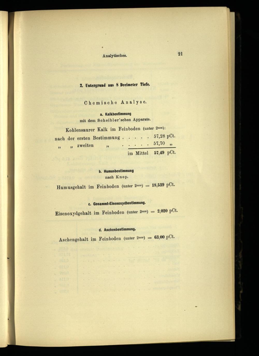 a. Kalkbestimmung mit dem Scheibler’schen Apparate. Kohlensaurer Kalk im Feinboden(unter 2mm): 57,28 pCt. zweiten» 571,10