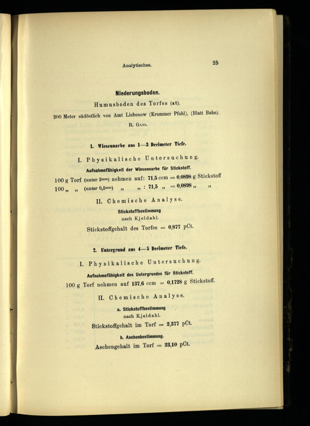 I. Physikalische Untersuchung. Aufnahmefähigkeit des Untergrundes für Stickstoff. 100 g Torf nehmen auf 137,6 ccm= 0.1728 g Stickstoff. Il. Chemische Analyse.