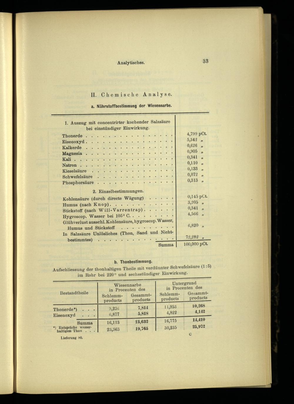 Aufschliessung der thonhaltigen Theile mit verdünnter Schwe felsäure(1:5) im Rohr bei 220% und sechsstündiger Einwirkung. FL ————————— Wiesennarbe Untergrund in Procenten des in Procenten des Schlemm- Gesammt- Schlemm- Gesammtproducts products products products |__PIOCNOS rss 10,268 4,822 4,142