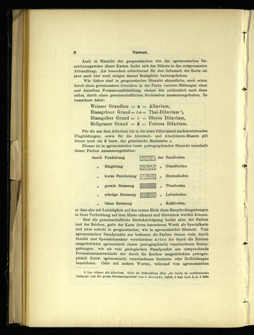 Erst die gemeinschaftliche Berücksichtigung beider aber, der Farben und der Zeichen, giebt der Karte ihren besonderen Werth als Specialkarte und zwar sowohl in geognostischer, wie in agronomischer Hinsicht. Vom agronomischen Standpunkte aus bedeuten die Farben ebenso viele, durch Bonität und Specialcharakter verschiedene Arten der durch die Zeichen ausgedrückten agronomisch(bezw. petrographisch) verschiedenen Bodengattungen, wie sie vom geologischen Standpunkte aus entsprechende Formationsunterschiede der durch die Zeichen ausgedrückten petrographisch(bezw. agronomisch) verschiedenen Gesteins- oder Erdbildungen bezeichnen. Oder mit andern Worten, während vom agronomischen