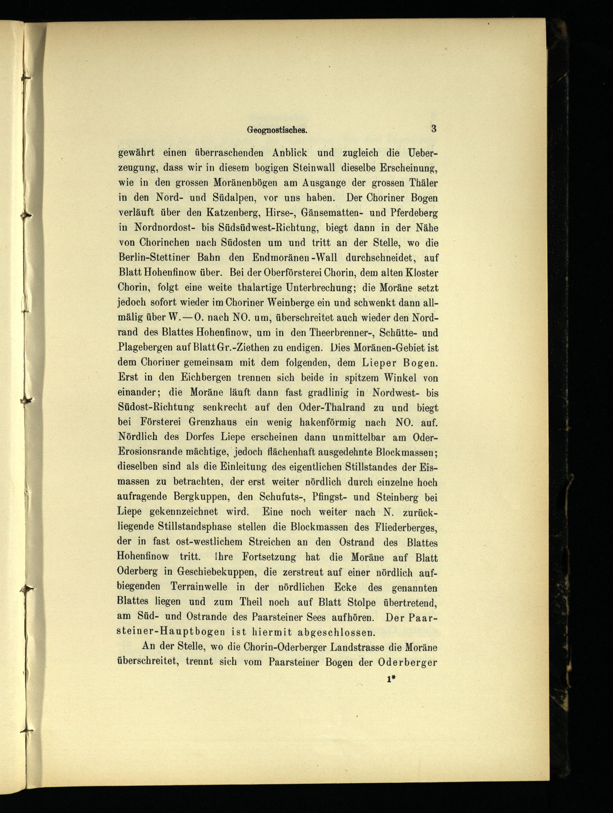 gewährt einen überraschenden Anblick und zugleich die Ueberzeugung, dass wir in diesem bogigen Steinwall dieselbe Erscheinung, wie in den grossen Moränenbögen am Ausgange der grossen Thäler in den Nord- und Südalpen, vor uns haben. Der Choriner Bogen verläuft über den Katzenberg, Hirse-, Gänsematten- und Pferdeberg in Nordnordost- bis Südsüdwest-Richtung, biegt dann in der Nähe von Chorinchen nach Südosten um und tritt an der Stelle, wo die Berlin-Stettiner Bahn den Endmoränen-Wall durchschneidet, auf Blatt Hohenfinow über. Bei der Oberförsterei Chorin , dem alten Kloster Chorin , folgt eine weite thalartige Unterbrechung; die Moräne setzt jedoch sofort wieder im Choriner Weinberge ein und schwenkt dann allmälig über W.—0. nach NO. um, überschreitet auch wieder den Nordrand des Blattes Hohenfinow , um in den Theerbrenner-, Schütte- und Plagebergen auf Blatt Gr.-Ziethen zu endigen. Dies Moränen-Gebiet ist dem Choriner gemeinsam mit dem folgenden, dem Lieper Bogen. Erst in den Kichbergen trennen sich beide in spitzem Winkel von einander; die Moräne läuft dann fast gradlinig in Nordwest- bis Südost-Richtung senkrecht auf den Oder-Thalrand zu und biegt bei Försterei Grenzhaus ein wenig hakenförmig nach NO. auf. Nördlich des Dorfes Liepe erscheinen dann unmittelbar am OderErosionsrande mächtige, jedoch flächenhaft ausgedehnte Blockmassen; dieselben sind als die Einleitung des eigentlichen Stillstandes der Eismassen zu betrachten, der erst weiter nördlich durch einzelne hoch aufragende Bergkuppen, den Schufuts-, Pfingst- und Steinberg bei Liepe gekennzeichnet wird. Eine noch weiter nach N. zurückliegende Stillstandsphase stellen. die Blockmassen des Fliederberges, der in fast ost-westlichem Streichen an den Ostrand des Blattes Hohenfinow tritt. Ihre Fortsetzung hat die Moräne auf Blatt Oderberg in Geschiebekuppen, die zerstreut auf einer nördlich aufbiegenden Terrainwelle in der nördlichen Ecke des genannten Blattes liegen und zum Theil noch auf Blatt Stolpe übertretend, am Süd- und Ostrande des Paarsteiner Sees aufhören. Der Paarsteiner-Hauptbogen ist hiermit abgeschlossen.
