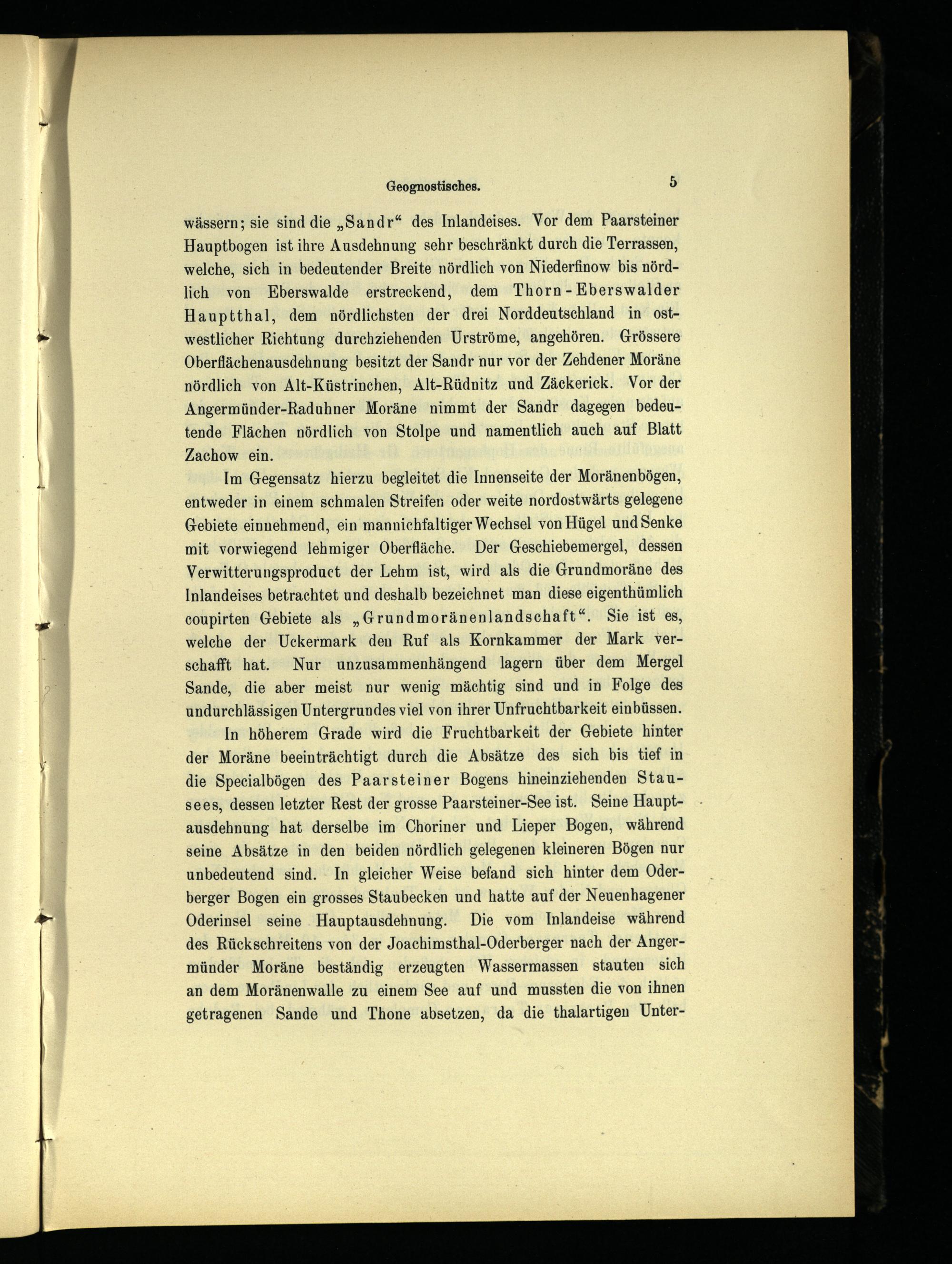 wässern; sie sind die„Sandr“ des Inlandeises. Vor dem Paarsteiner Hauptbogen ist ihre Ausdehnung sehr beschränkt durch die Terrassen, welche, sich in bedeutender Breite nördlich von Niederfinow bis nördlich von Eberswalde erstreckend, dem Thorn-KEberswalder Hauptthal, dem nördlichsten der drei Norddeutschland in ostwestlicher Richtung durchziehenden Urströme, angehören. Grössere Oberflächenausdehnung besitzt der Sandr nur vor der Zehdener Moräne nördlich von Alt-Küstrinchen, Alt-Rüdnitz und Zäckerick . Vor der Angermünder-Raduhner Moräne nimmt der Sandr dagegen bedeutende Flächen nördlich von Stolpe und namentlich auch auf Blatt Zachow ein.