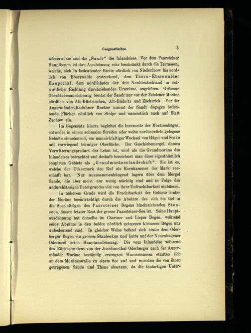 In höherem Grade wird die Fruchtbarkeit der Gebiete hinter der Moräne beeinträchtigt durch die Absätze des sich bis tief in die Specialbögen des Paarsteiner Bogens hineinziehenden Stausees, dessen letzter Rest der grosse Paarsteiner-See ist. Seine Hauptausdehnung hat derselbe im Choriner und Lieper Bogen, während seine Absätze in den beiden nördlich gelegenen kleineren Bögen nur unbedeutend sind. In gleicher Weise befand sich hinter dem Oderberger Bogen ein grosses Staubecken und hatte auf der Neuenhagener Oderinsel seine Hauptausdehnung. Die vom Inlandeise während des Rückschreitens von der Joachimsthal -Oderberger nach der Anger münder Moräne beständig erzeugten Wassermassen stauten sich an dem Moränenwalle zu einem See auf und mussten die von ihnen getragenen Sande und Thone absetzen, da die thalartigen Unter