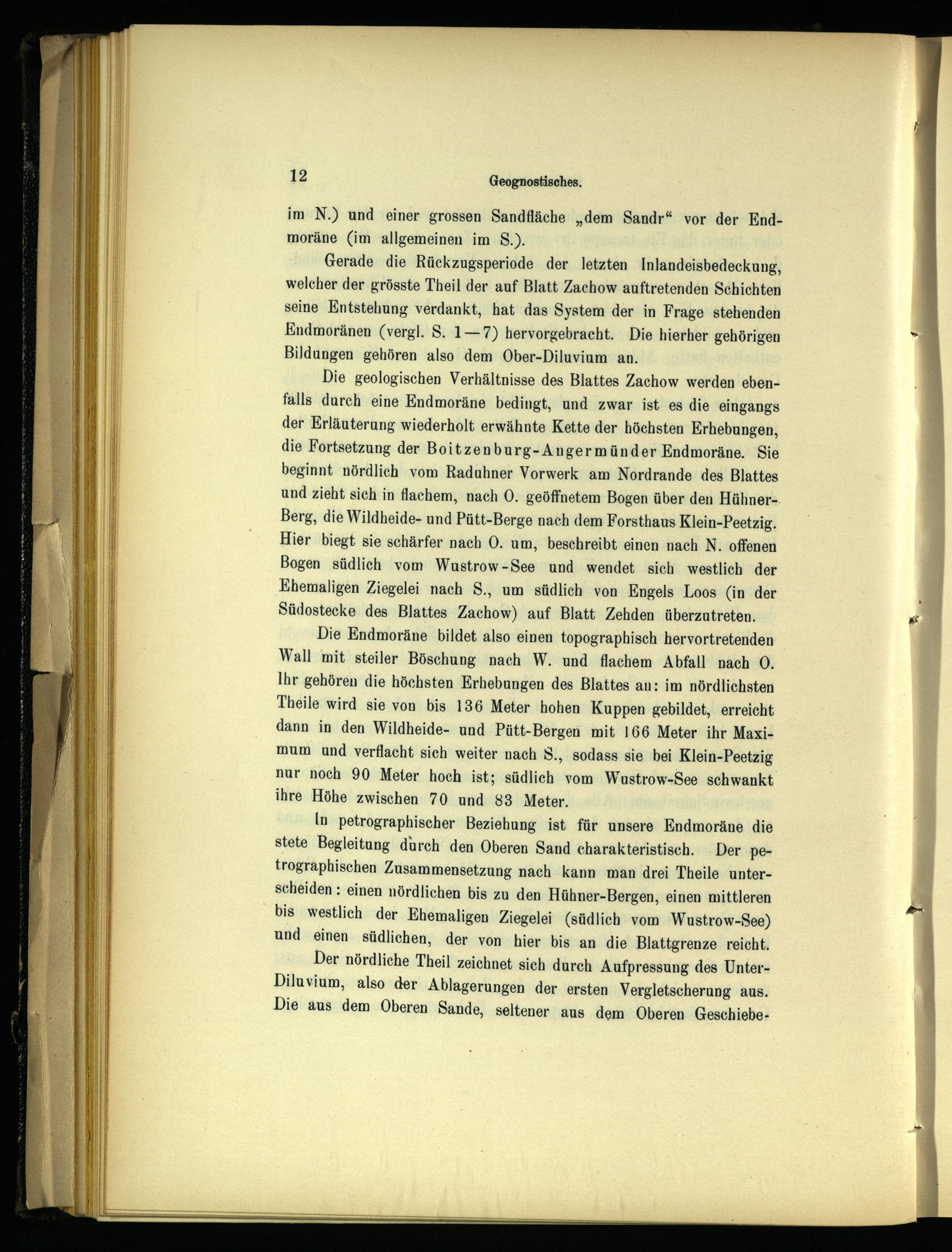 Die geologischen Verhältnisse des Blattes Zachow werden ebenfalls durch eine Endmoräne bedingt, und zwar ist es die eingangs der Erläuterung wiederholt erwähnte Kette der höchsten Erhebungen, die Fortsetzung der Boitzenburg-Angermünder Endmoräne. Sie beginnt nördlich vom Raduhner Vorwerk am Nordrande des Blattes und zieht sich in flachem, nach 0. geöffnetem Bogen über den Hühner-. Berg , die Wildheide- und Pütt-Berge nach dem Forsthaus Klein-Peetzig. Hier biegt sie schärfer nach 0. um, beschreibt einen nach N. offenen Bogen südlich vom Wustrow -See und wendet sich westlich der Ehemaligen Ziegelei nach S., um südlich von Engels Loos(in der Südostecke des Blattes Zachow) auf Blatt Zehden überzutreten.