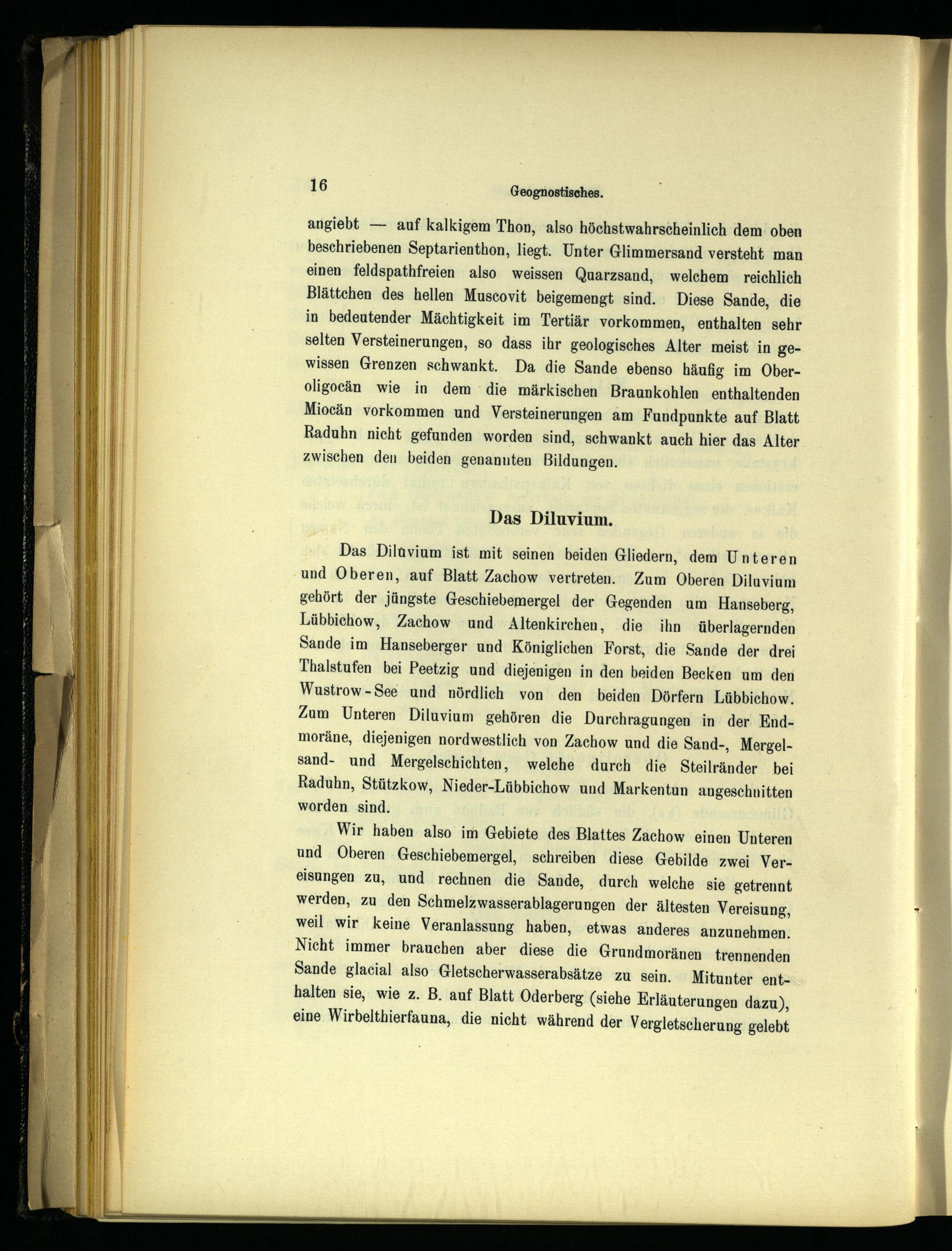 Wir haben also‘ im Gebiete des Blattes Zachow einen Unteren und Oberen.Geschiebemergel, schreiben diese Gebilde zwei Vereisungen zu, und rechnen die Sande, durch welche sie getrennt werden, zu den Schmelzwasserablagerungen der ältesten Vereisung, weil wir keine Veranlassung haben, etwas anderes anzunehmen. Nicht immer brauchen aber diese die Grundmoränen trennenden Sande glacial also Gletscherwasserabsätze zu sein. Mitunter enthalten sie, wie z. B. auf Blatt Oderberg (siehe Erläuterungen dazu), eine Wirbelthierfauna, die nicht während der Vergletscherung gelebt