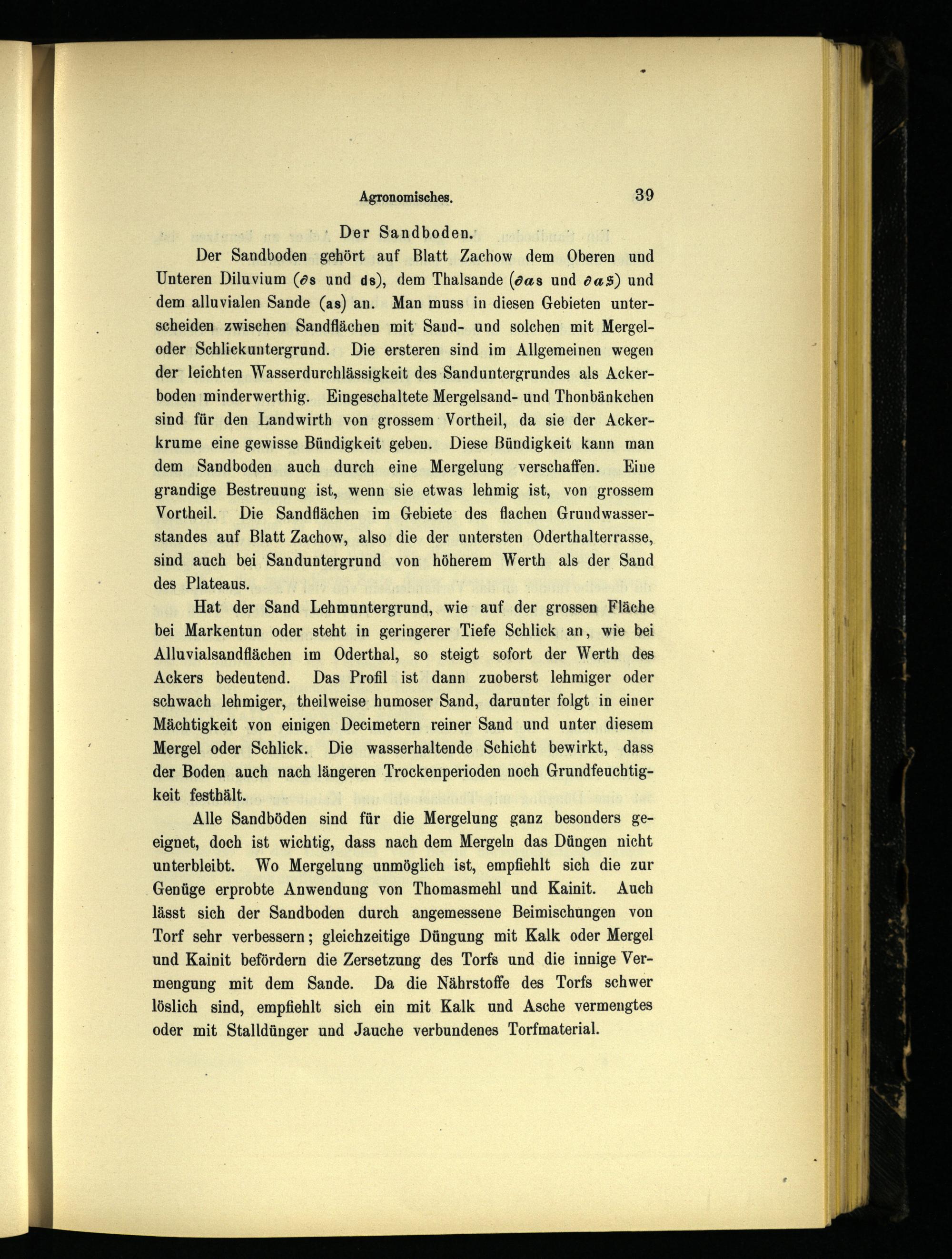 Der Sandboden gehört auf Blatt Zachow dem Oberen und Unteren Diluvium(ds und ds), dem Thalsande(d@s und das) und dem alluvialen Sande(as) an. Man muss in diesen Gebieten unterscheiden. zwischen Sandflächen mit‘ Sand- und solchen mit Mergeloder Schliekuntergrund. Die ersteren sind im Allgemeinen wegen der leichten Wasserdurchlässigkeit des Sanduntergrundes als Ackerboden minderwerthig. Eingeschaltete Mergelsand- und Thonbänkchen sind für den Landwirth von grossem Vortheil, da sie der Ackerkrume eine gewisse Bündigkeit geben. Diese Bündigkeit kann man dem Sandboden auch durch eine Mergelung verschaffen. Kine grandige Bestreuung ist, wenn sie etwas lehmig ist, von grossem Vortheil. Die Sandflächen im Gebiete des flachen Grundwasserstandes auf Blatt Zachow, also die der untersten Oderthalterrasse, sind auch bei Sanduntergrund von höherem Werth als der Sand des Plateaus.