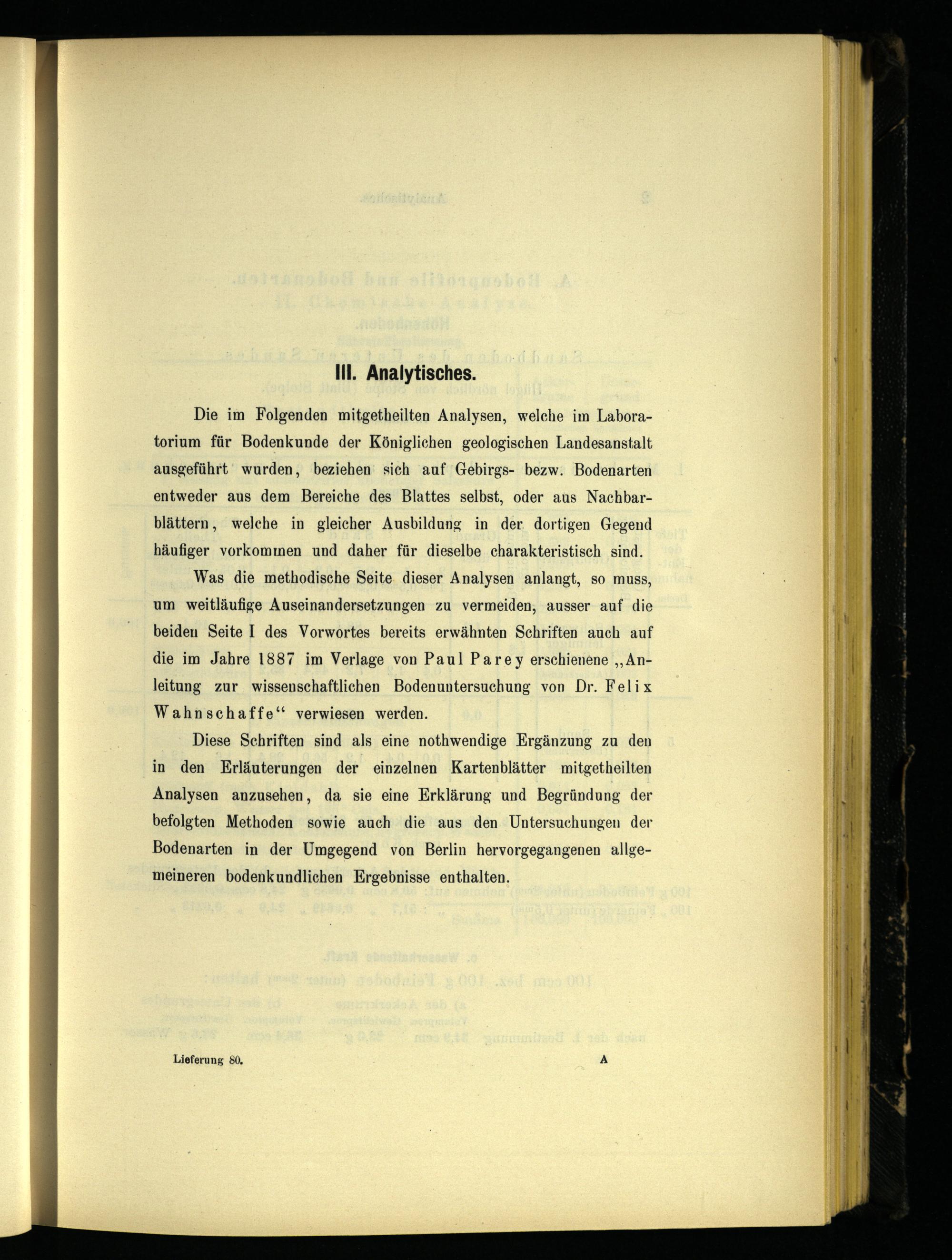 Was die methodische Seite. dieser Analysen anlangt, so muss, um weitläufige Auseinandersetzungen zu vermeiden, ausser auf die beiden Seite I des Vorwortes bereits erwähnten Schriften auch auf die im Jahre 1887 im Verlage von Paul Parey erschienene„„Anleitung zur wissenschaftlichen Bodenuntersuchung von Dr. Felix Wahnschaffe‘‘ verwiesen werden.