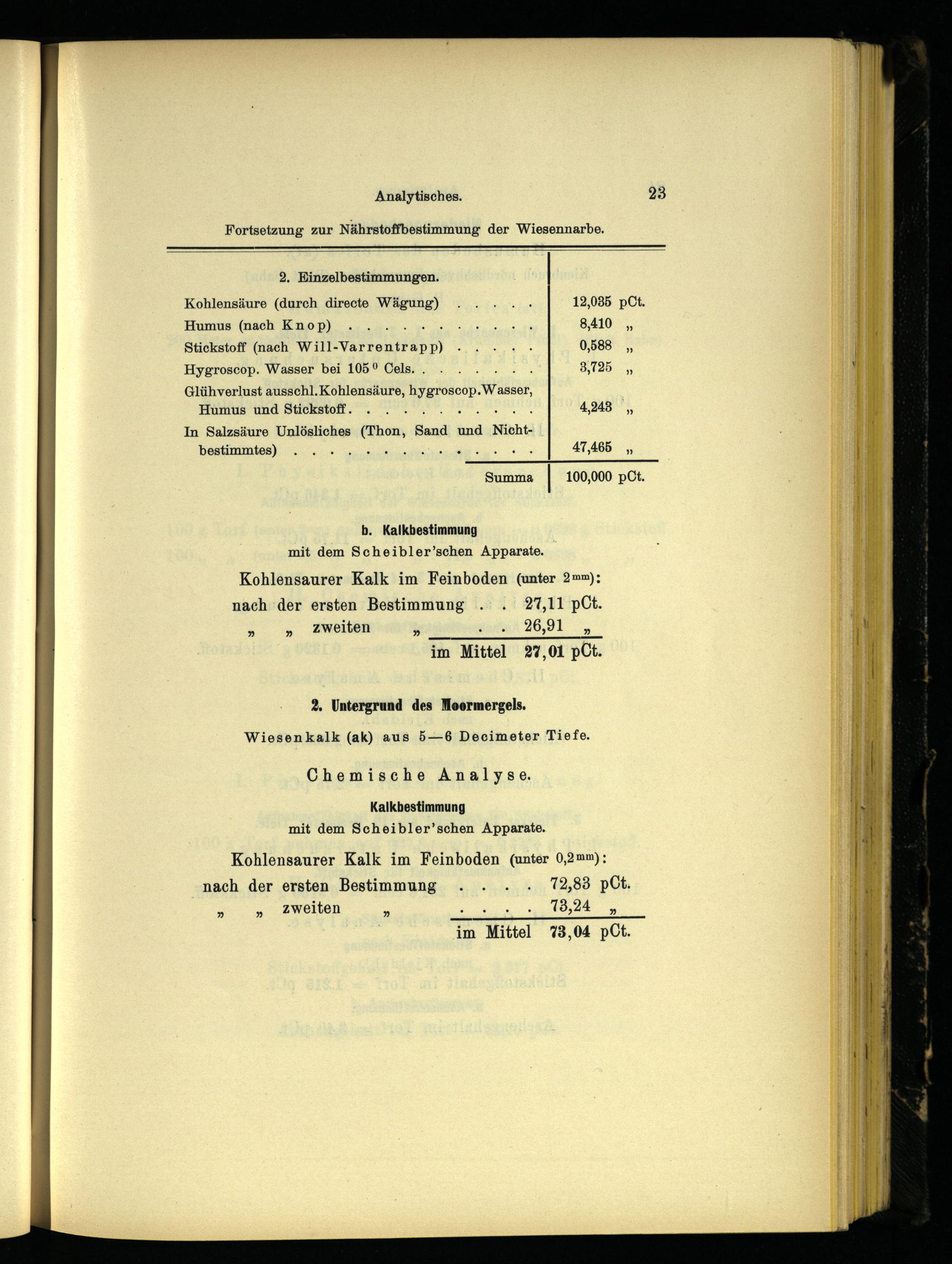 Kohlensäure(durch directe Wägung)....- 12,085 pCt. Humus(nach Knop).... Che nn te 8,410 Stickstoff(nach Will Varrentrapp) nr 0,588 Hygroscop. Wasser bei 105° Cels........ 3,725