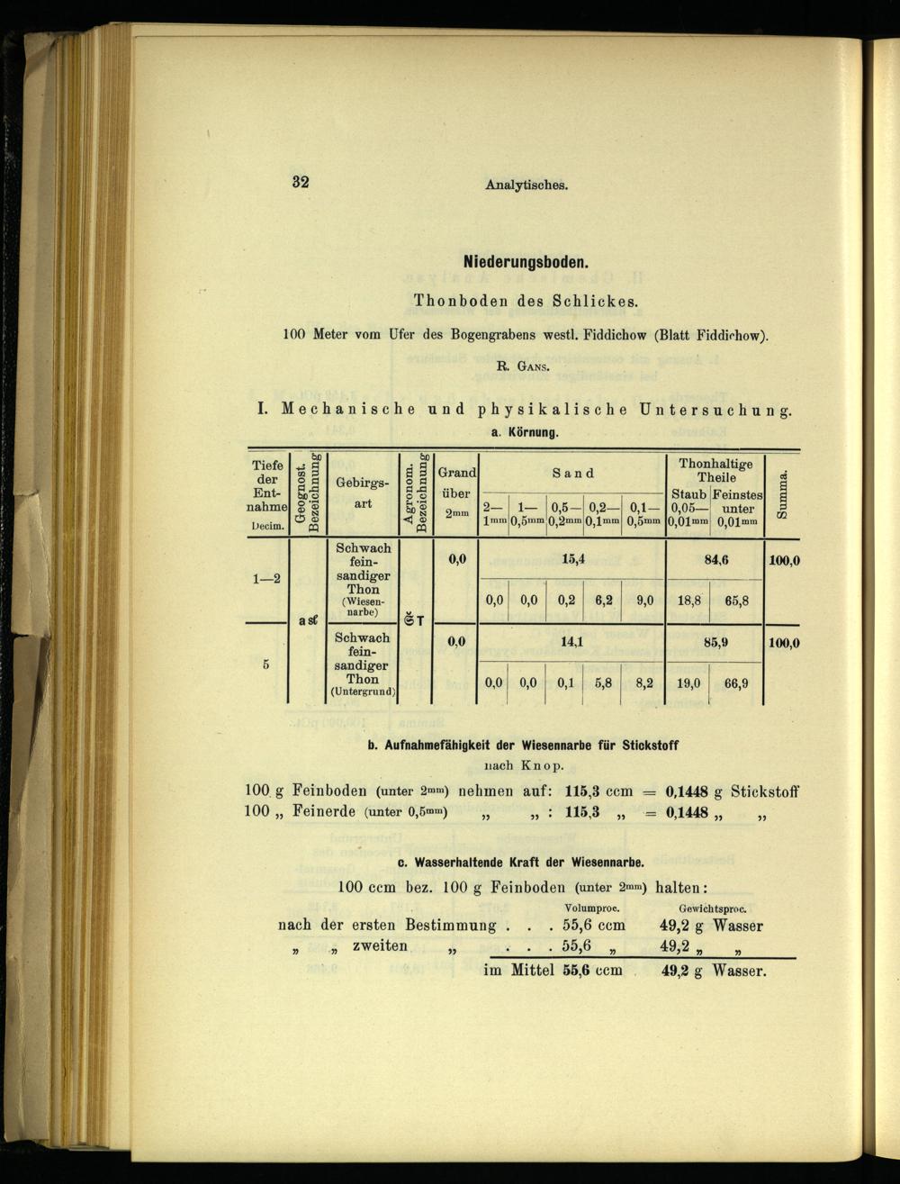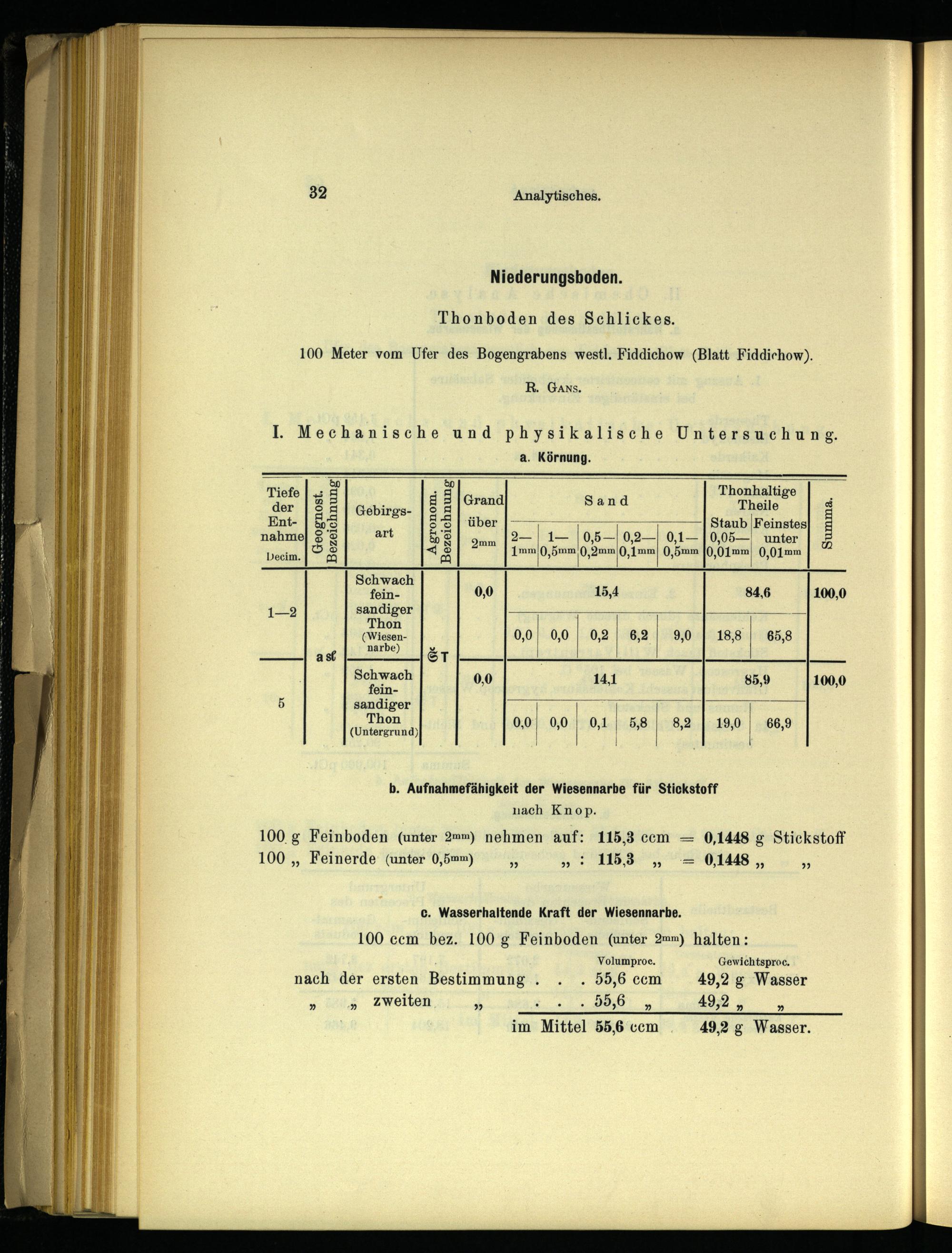 100 ccm bez. 100 g Feinboden(unter 2mm) halten: Volumproe. Gewichtsproc. nach der ersten Bestimmung... 55,6 ccm 49,2 g Wasser zweiten«. 09,6 49,2” im Mittel 55,6 ccm 49,2 g Wasser.