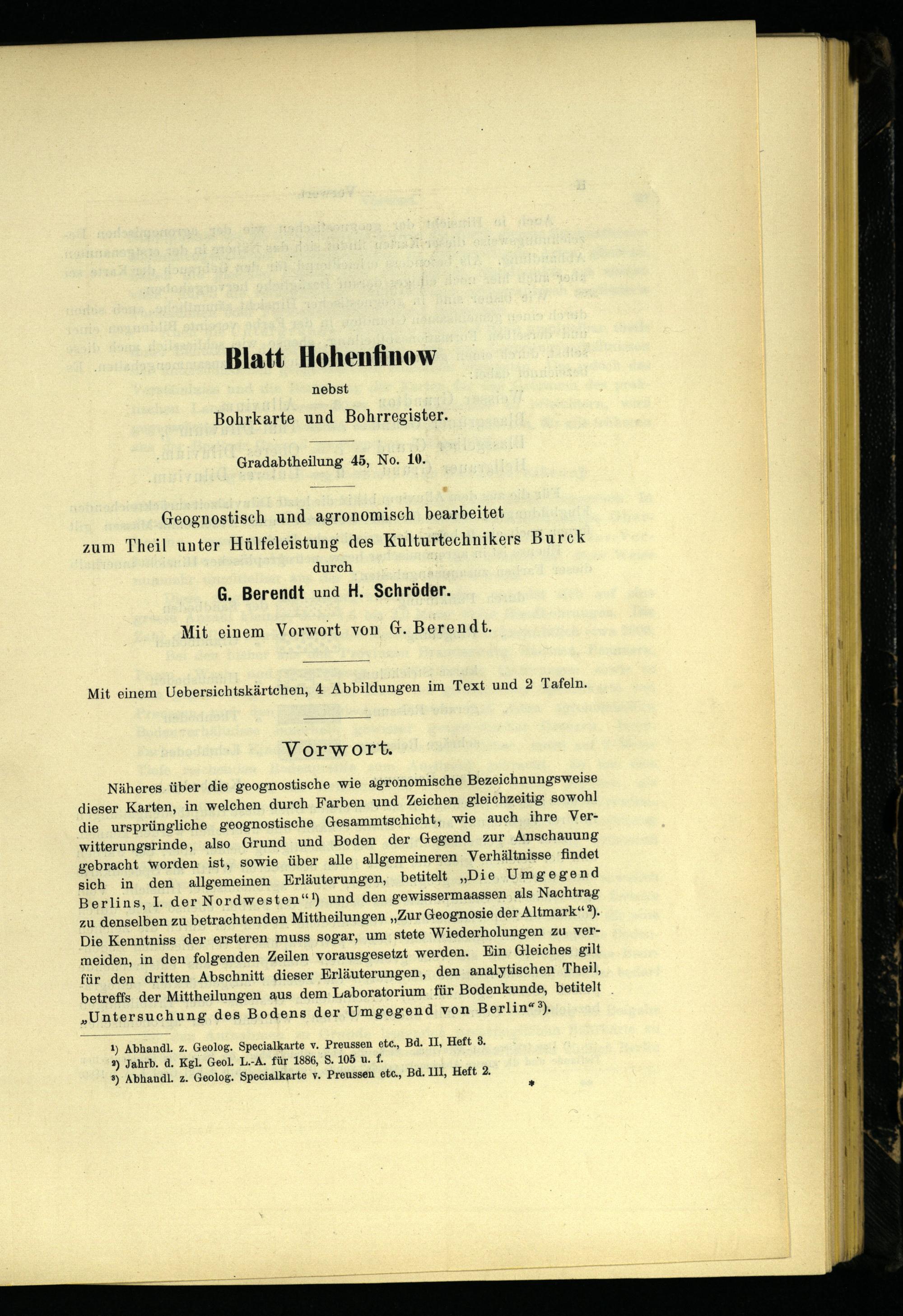 Näheres. über die geognostische wie agronomische Bezeichnungsweise dieser Karten, in welchen durch Farben und Zeichen gleichzeitig sowohl die ursprüngliche geognostische Gesammtschicht, wie auch ihre Verwitterungsrinde, also Grund und Boden der Gegend zur Anschauung gebracht worden ist, sowie über alle allgemeineren Verhältnisse findet sich in den allgemeinen Erläuterungen, betitelt„Die Umgegend Berlins , I. der Nordwesten‘“!) und den gewissermaassen als Nachtrag zu denselben zu betrachtenden Mittheilungen„Zur Geognosie der Altmark “ 2). Die Kenntniss der ersteren muss sogar, um stete Wiederholungen zu vermeiden, in den folgenden Zeilen vorausgesetzt werden. Ein Gleiches gilt für den dritten Abschnitt dieser Erläuterungen, den analytischen Theil, betreffs der Mittheilungen aus dem Laboratorium für Bodenkunde, betitelt „Untersuchung des Bodens der Umgegend von Berlin “ 3).