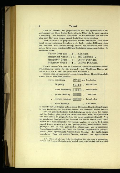 Auch in Hinsicht der geognostischen wie der agronomischen Bezeichnungsweise dieser Karten findet sich das Nähere in der erstgenannten Abhandlung. Als besonders erleichternd für den Gebrauch der Karte sei aber auch hier noch einiges darauf Bezügliche hervorgehoben.