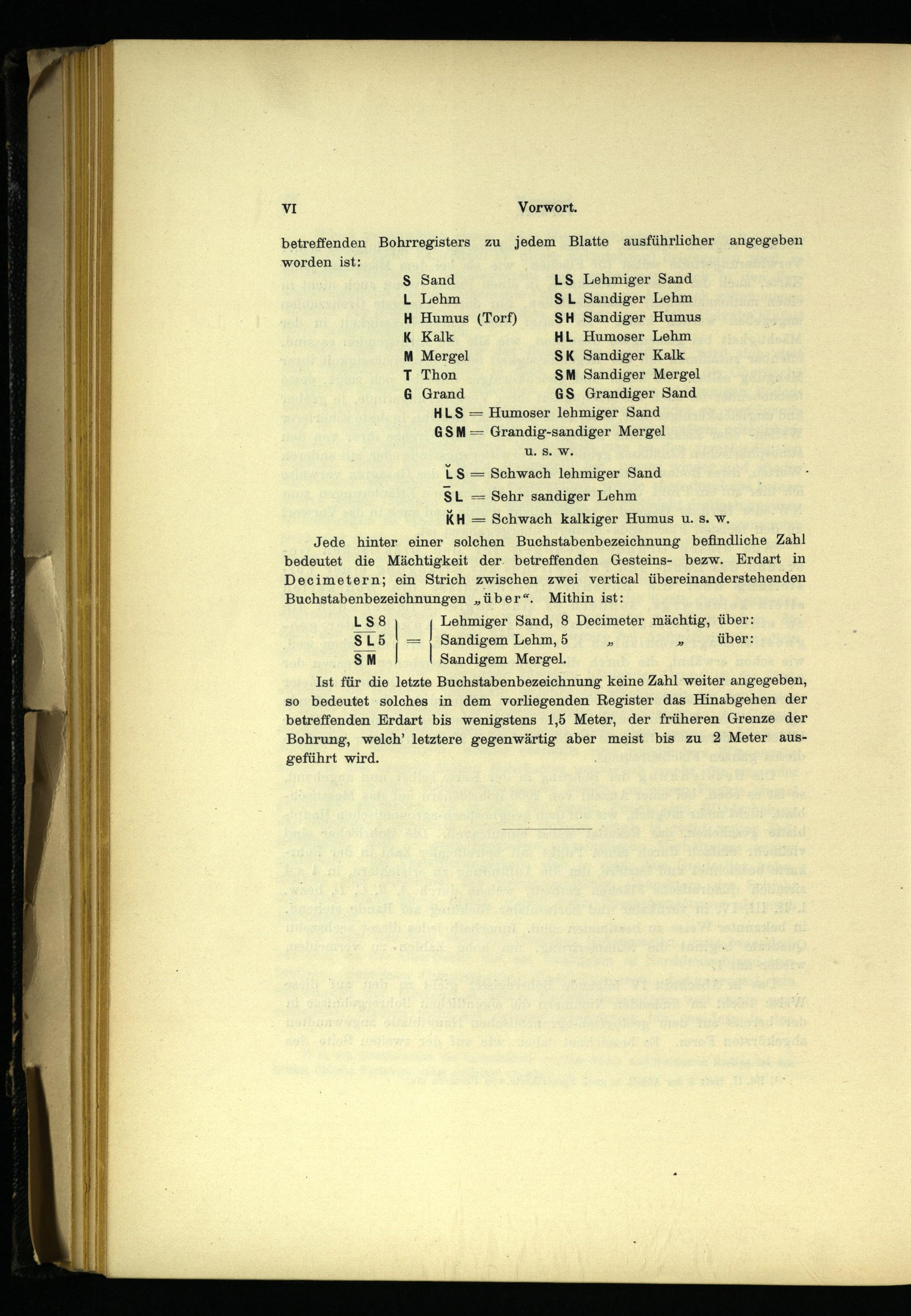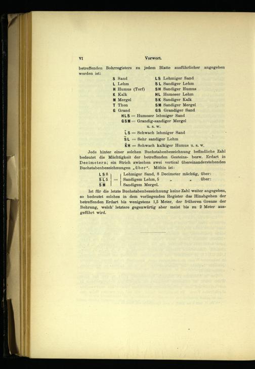 Ist für die letzte Buchstabenbezeichnung keine Zahl weiter angegeben, so bedeutet solches in dem vorliegenden Register das Hinabgehen der betreffenden Erdart bis wenigstens 1,5 Meter, der früheren Grenze der Bohrung, welch’ letztere gegenwärtig aber meist bis zu 2 Meter ausgeführt wird.
