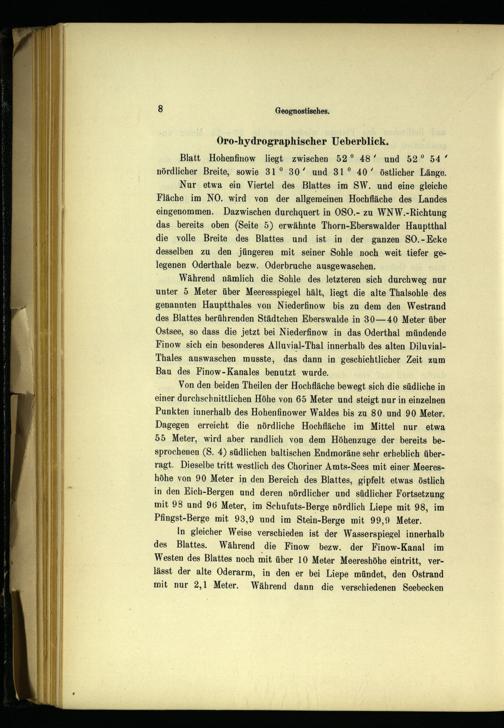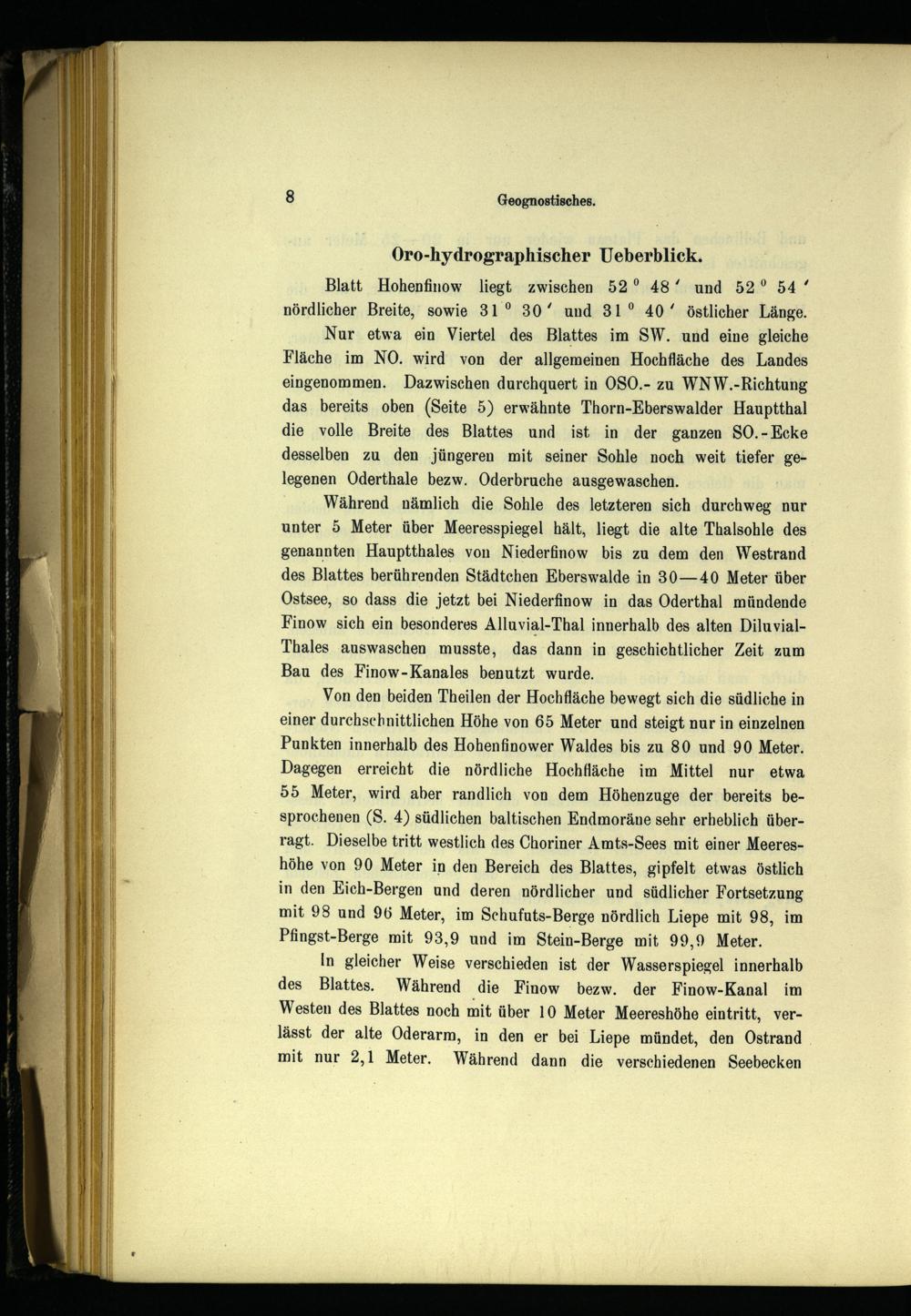 Während nämlich die Sohle des letzteren sich durchweg nur unter 5 Meter über Meeresspiegel hält, liegt die alte Thalsohle des genannten Hauptthales von Niederfinow bis zu dem den Westrand des Blattes berührenden Städtchen Eberswalde in 30—40 Meter über Ostsee , so dass die jetzt bei Niederfinow in das Oderthal mündende Finow sich ein besonderes Alluvial-Thal innerhalb des alten DiluvialThales auswaschen musste, das dann in geschichtlicher Zeit zum Bau des Finow-Kanales benutzt wurde.