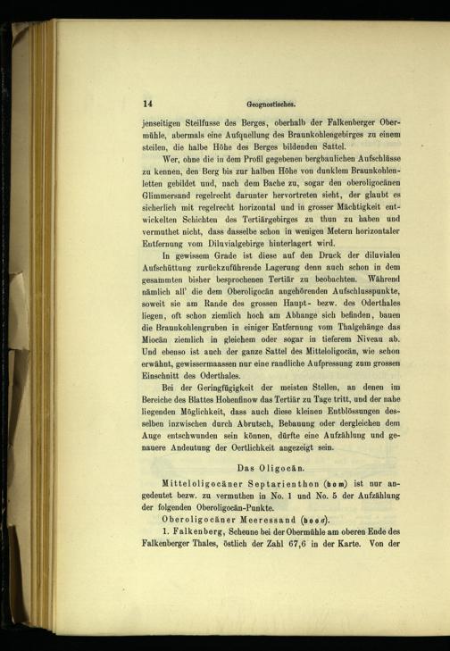 In gewissem Grade ist diese auf den Druck der diluvialen Aufschüttung zurückzuführende Lagerung denn auch schon in dem gesammten bisher besprochenen Tertiär zu beobachten. Während nämlich all’ die dem Oberoligocän angehörenden Aufschlusspunkte, soweit sie am Rande des grossen Haupt- bezw. des Oderthales liegen, oft schon ziemlich hoch am Abhange sich befinden, bauen die Braunkohlengruben in einiger Entfernung vom Thalgehänge das Miocän ziemlich in gleichem oder sogar in tieferem Niveau ab. Und ebenso ist auch der ganze Sattel des Mitteloligocän, wie schon erwähnt, gewissermaassen nur eine randliche Aufpressung zum grossen Einschnitt des Oderthales.