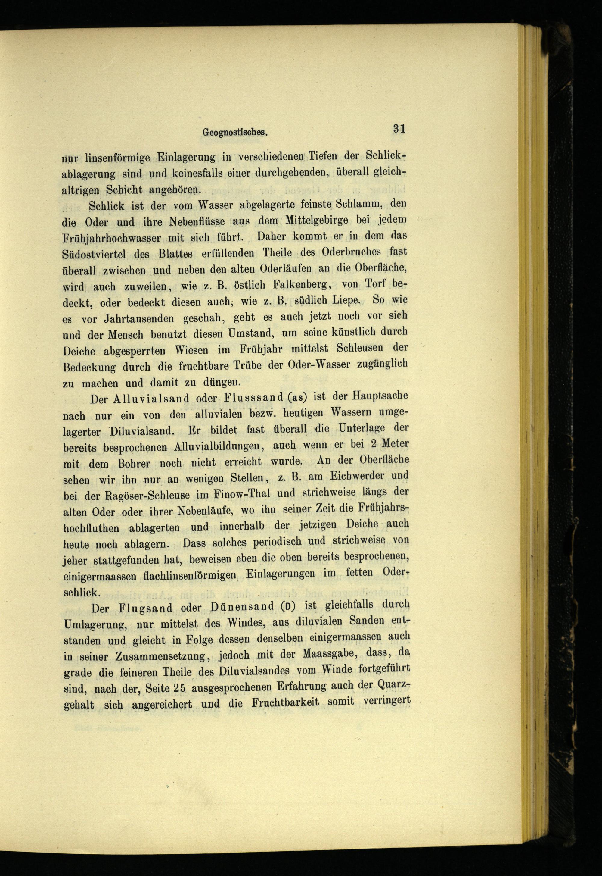 Der Alluvialsand oder. Flusssand(as) ist der Hauptsache nach nur ein von den alluvialen bezw. heutigen Wassern umgelagerter Diluvialsand. Er bildet fast überall ‚die Unterlage der bereits besprochenen Alluvialbildungen, auch wenn er bei 2 Meter mit. dem Bohrer noch. nicht erreicht wurde. An der Oberfläche sehen. wir ihn nur an wenigen Stellen, z. B. am Kichwerder und bei der Ragöser-Schleuse im Finow-Thal und strichweise längs der alten Oder oder ihrer Nebenläufe, wo ihn seiner Zeit die Frühjahrshochfluthen;ablagerten und innerhalb der jetzigen Deiche- auch heute noch ablagern.. Dass solches periodisch und strichweise, von jeher stattgefunden hat, beweisen eben. die oben bereits besprochenen, einigermaassen flachlinsenförmigen Einlagerungen im fetten Oderschlick.)