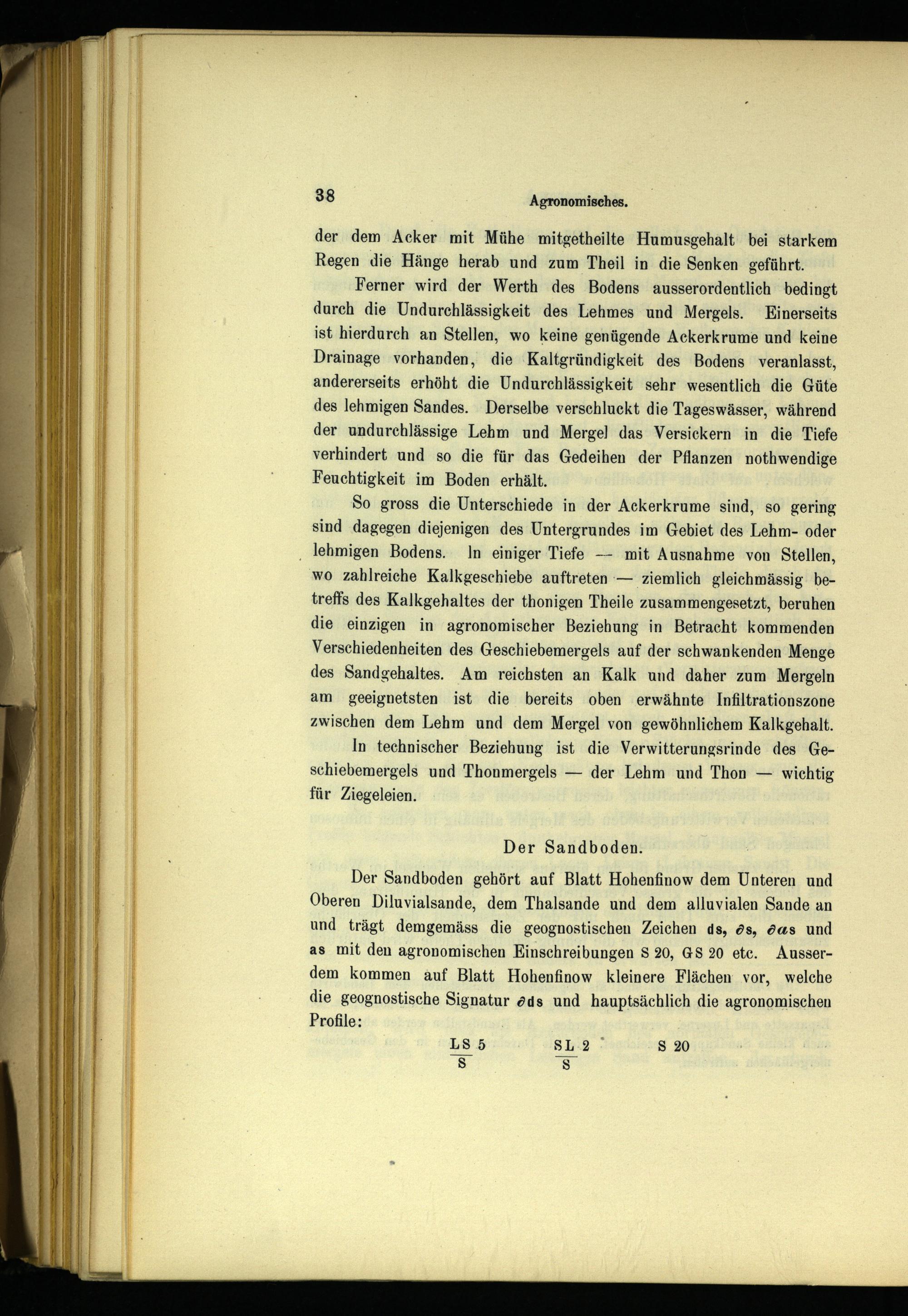 Der Sandboden gehört auf Blatt Hohenfinow dem Unteren und Oberen Diluvialsande, dem Thalsande und dem alluvialen Sande an und trägt demgemäss die geognostischen Zeichen ds, ds, das und as mit den agronomischen Einschreibungen S 20, GS 20 etc. Ausserdem kommen auf Blatt Hohenfinow kleinere Flächen vor, welche die geognostische Signatur öds und hauptsächlich die agronomischen Profile:
