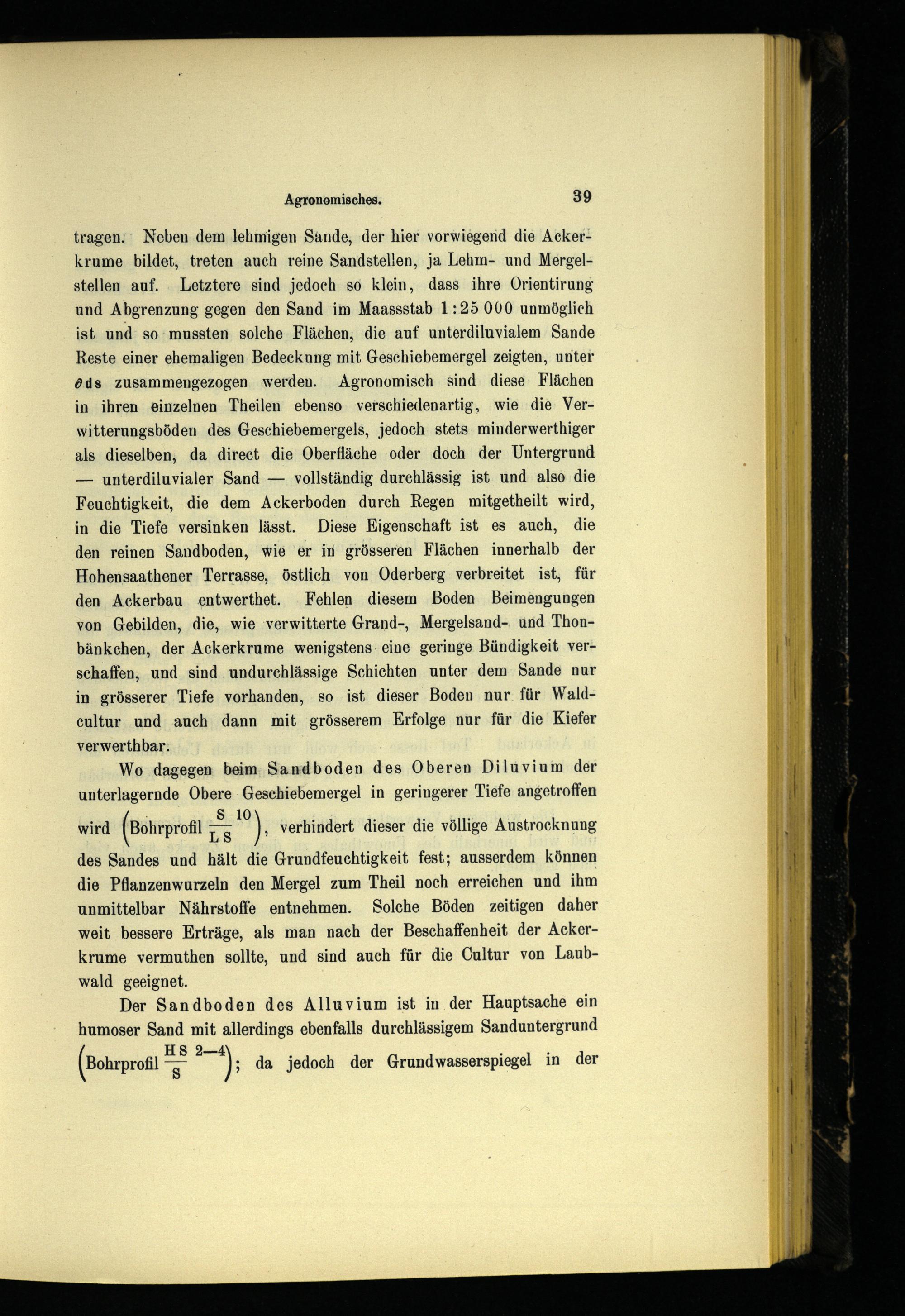 des Sandes und hält die Grundfeuchtigkeit fest; ausserdem können die Pflanzenwurzeln den Mergel zum Theil noch erreichen und ihm unmittelbar Nährstoffe entnehmen. Solche Böden zeitigen daher weit bessere Erträge, als man nach der Beschaffenheit der Ackerkrume vermuthen sollte, und sind auch für die Cultur von Laubwald geeignet.