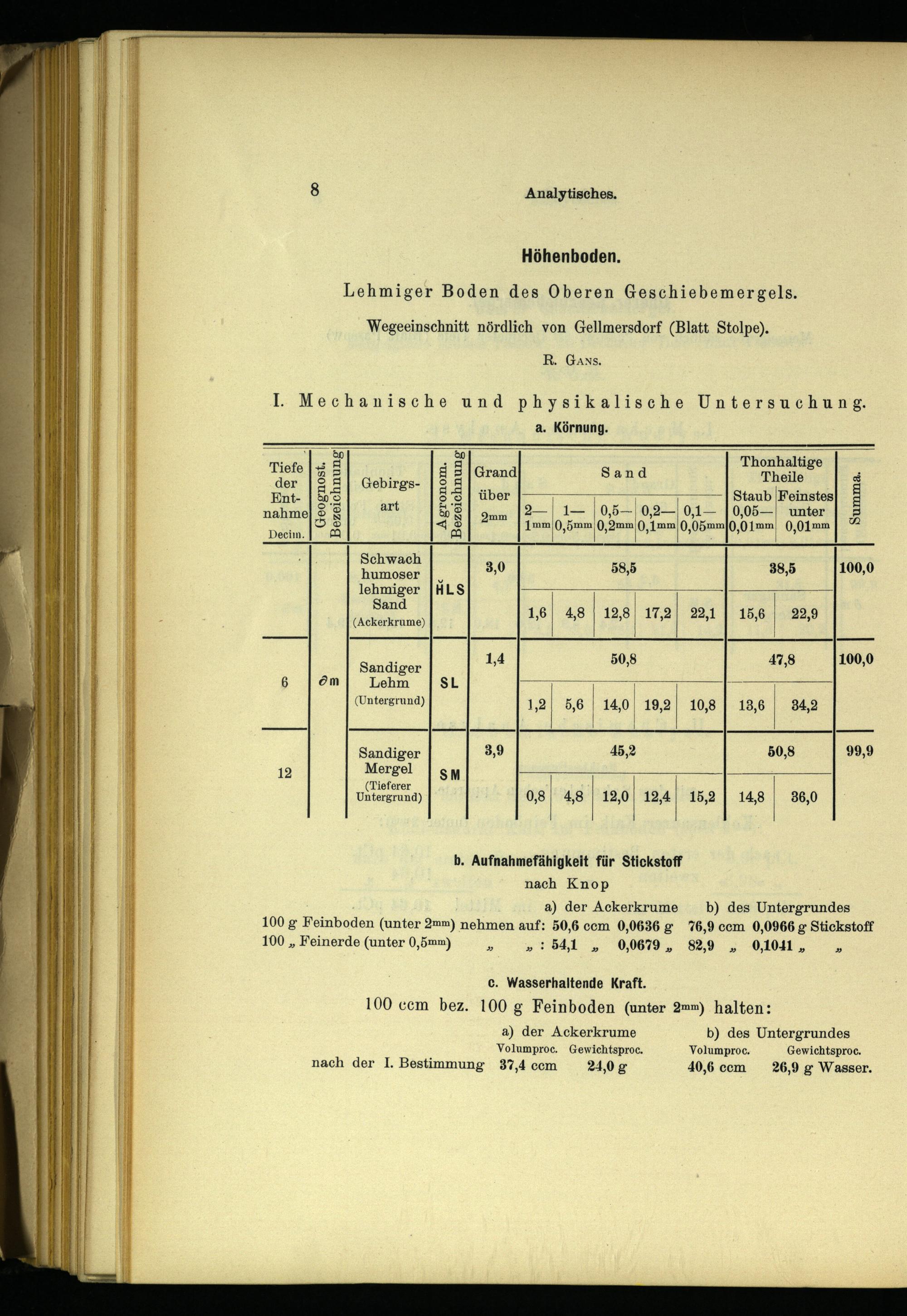 a. Körnung. Sl= Thonhaltige Tiefe|; 5: g 5|Grand Sand Theile| der|S S| Gebirgs- SE@? Ent-|&'S 8-3] über Staub /Feinstes 3 nahme|® 8 art&3| mm|2— 1— 0,5— 0,2— 0,1—|0,05— unter| 3 A OS<© 1mm 0,5mm 0,2mm 0,1mm 0,05mm 0,01mm 0,01mm Decim.[02][a2] 8 Schwach humoser| 8,0 58,5 38,5 100,0 lehmiger|HLS Sand 1,6| 4,8| 12,8| 17,2! 22,1| 15,6| 22,9 (Ackerkrume) 100,0 Sandiger M 505 47:5’ 6 öm Lehm SL 7 (Untergrund) 1,2/ 5,6| 14,0| 19,2| 10,8| 183,6| 34,2 Sandiger 3,9 45,2 50,8 99,9 12 Mergel SM ief AearaG) 0,8 4,8| 12,0| 124 15,2| 14,8| 36,0