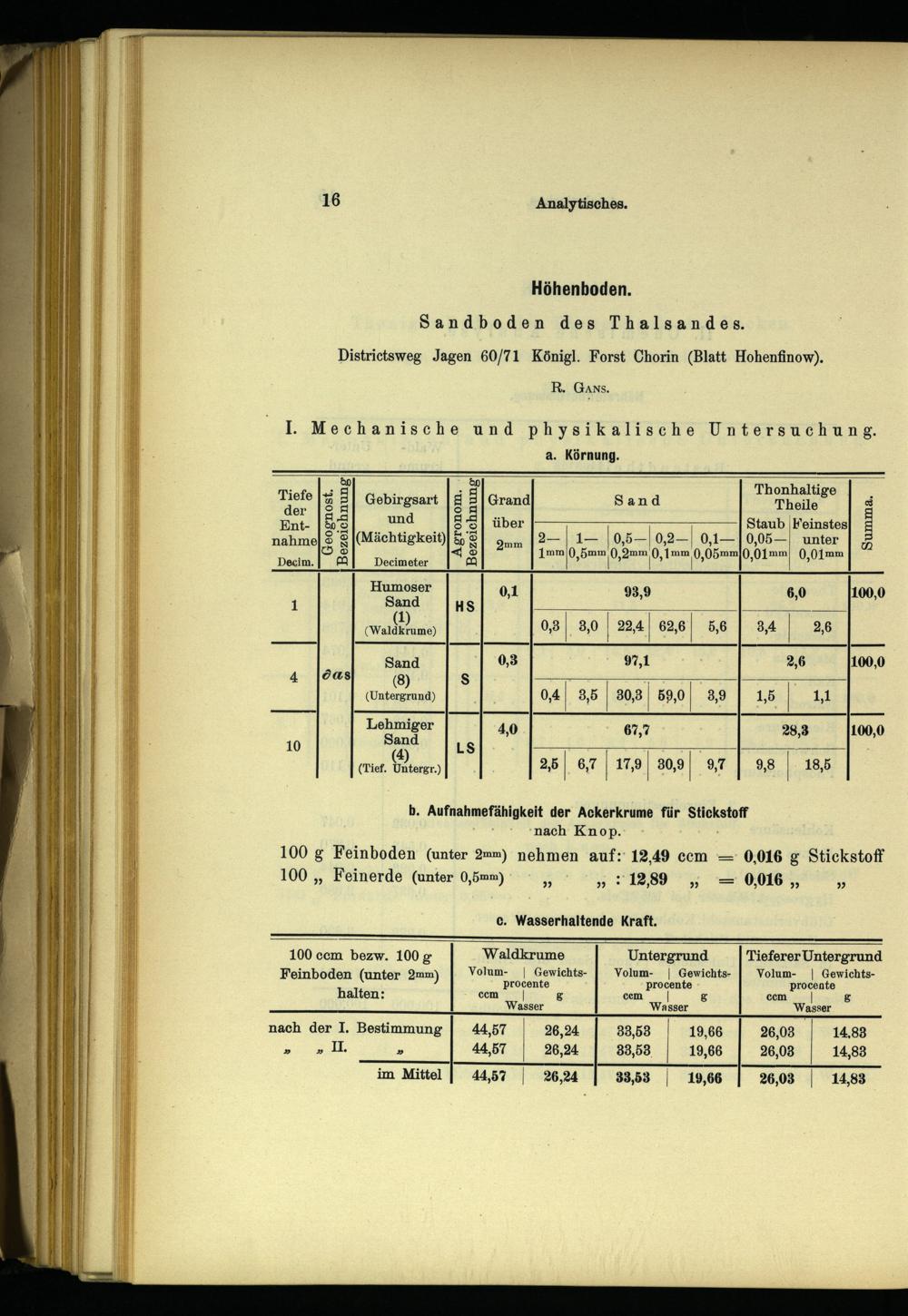 ‘nach Knop.. 100 g Feinboden(unter 2mm) nehmen auf: 12,49 ccm= 0,016 g Stickstoff 100„„ Feinerde(unter 0,5mm)„ 12,89 ‚,,= 0,016,