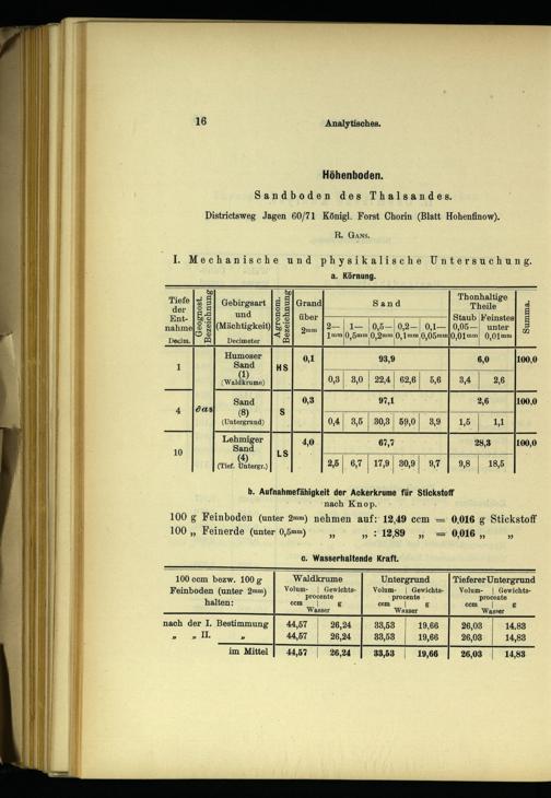 a. Körnung. a0"80 .. Thonhalti, un@ E Gebirgsart 8 3 Grand Sand Theile” S er Ent- Ss und 8-51 über Staub Feinstes: nahme]© 8(Mächtigkeit)&S Ymm 2—| 1—|10,5—|0,2—| 0,1—1| 0,05 unter| 5 ©©<© 1mm 0,5mm 0,2mm 0,1mm 0,05mm 0,01mm 0, 01mm Decim en Decimeter[22] Humoser 0,1 93,9 6,0 100,0 Sand HS Wale nme) 0,8| 3,0| 22,4| 62,6] 5,6 83,4 2,6 Sand 0,3 97,1 2,6 100,0 4|0as(8) s 7 (Untergrund) 0,4| 3,5 30,3 59,0| 3,9 1,5 1,1 Lehmiger 4,0 67,7 28,3 100,0 (rot. Goterer) 25| 6,7| 17,9| 30,9| 9,7| 9,8| 18,5