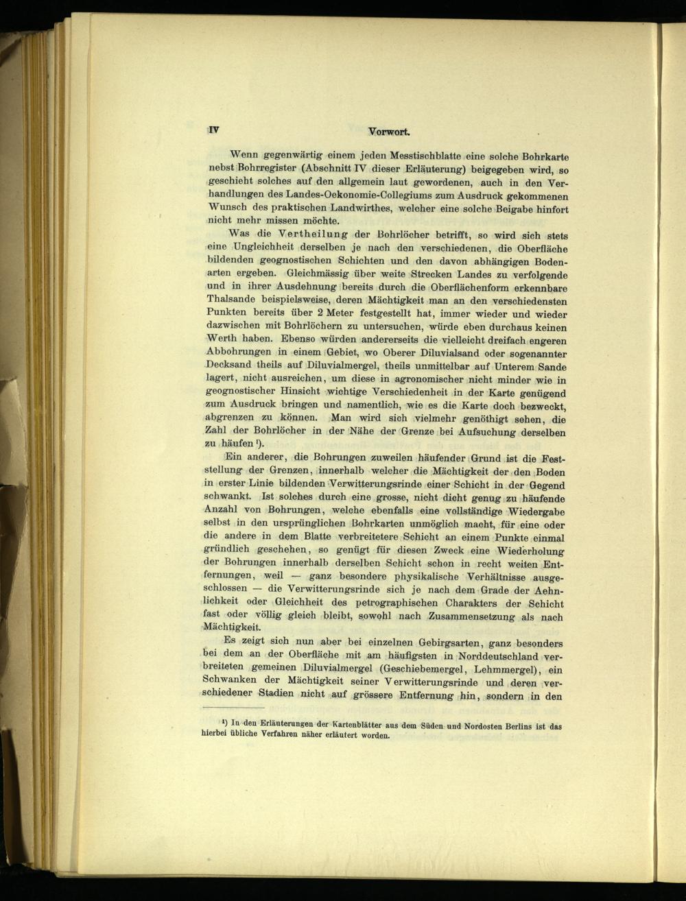 Was die Vertheilung ‚der Bohrlöcher betrifft, so wird ‚sich ‚stets eine ‚Ungleichheit ‚derselben je nach den verschiedenen, die Oberfläche bildenden geognostischen Schichten und den davon abhängigen Bodenarten ergeben. ‚Gleichmässig über weite ‚Strecken Landes zu verfolgende und in ihrer Ausdehnung‘bereits ‚durch ‚die ‚Oberflächenform erkennbare Thalsande beispielsweise, ‚deren Mächtigkeit ‚man an den verschiedensten Punkten bereits über 2 Meter festgestellt hat, immer wieder und wieder dazwischen mit Bohrlöchern zu untersuchen, würde eben durchaus keinen Werth haben. Ebenso würden andererseits die vielleicht dreifach engeren Abbohrungen ‚in ‚einem‘Gebiet, wo Oberer Diluvialsand oder sogenannter Decksand theils auf:Diluvialmergel, ‚theils unmittelbar auf Unterem: Sande lagert, nicht ausreichen, um diese in agronomischer ‚nicht minder wie in geognostischer Hinsicht ‚wichtige Verschiedenheit ‚in ‚der‘Karte genügend zum Ausdruck bringen und namentlich, wie ‚es die Karte doch bezweckt, abgrenzen zu können. Man wird ‚sich ‚vielmehr genöthigt sehen, die Zahl ‚der Bohrlöcher iin der /Nähe der‘Grenze ‚bei Aufsuchung derselben zu ‚häufen').