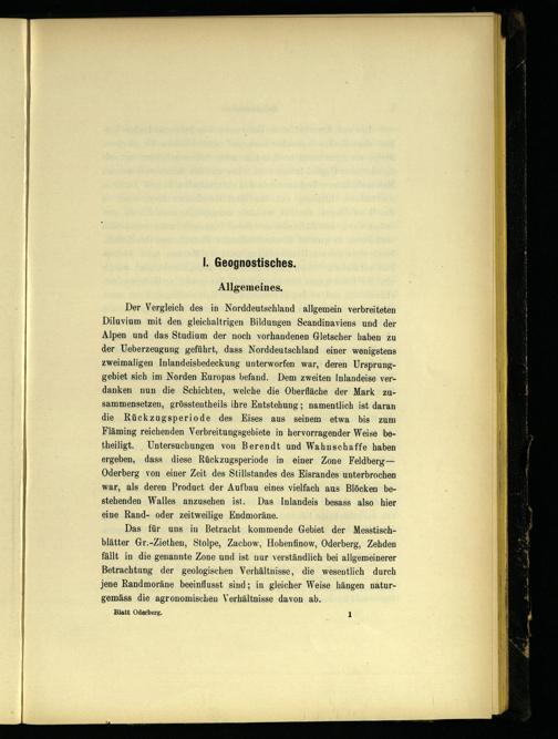 Der Vergleich des in Norddeutschland allgemein verbreiteten Diluvium mit den gleichaltrigen Bildungen Scandinaviens und der Alpen und das Studium der noch vorhandenen Gletscher haben zu der Ueberzeugung geführt, dass Norddeutschland einer wenigstens zweimaligen Inlandeisbedeckung unterworfen war, deren Ursprunggebiet sich im Norden Europas befand. Dem zweiten Inlandeise verdanken nun die Schichten, welche die Oberfläche der Mark zusammensetzen, grösstentheils ihre Entstehung; namentlich ist daran die Rückzugsperiode des KEises aus seinem etwa bis zum Fläming reichenden Verbreitungsgebiete in hervorragender Weise betheiligt. Untersuchungen von Berendt und Wahnschaffe haben ergeben, dass diese Rückzugsperiode in einer Zone Feldberg— Oderberg von einer Zeit des Stillstandes des Eisrandes unterbrochen war, als deren Product der Aufbau. eines vielfach aus Blöcken bestehenden Walles anzusehen ist. Das Inlandeis besass also hier eine Rand- oder zeitweilige Endmoräne.