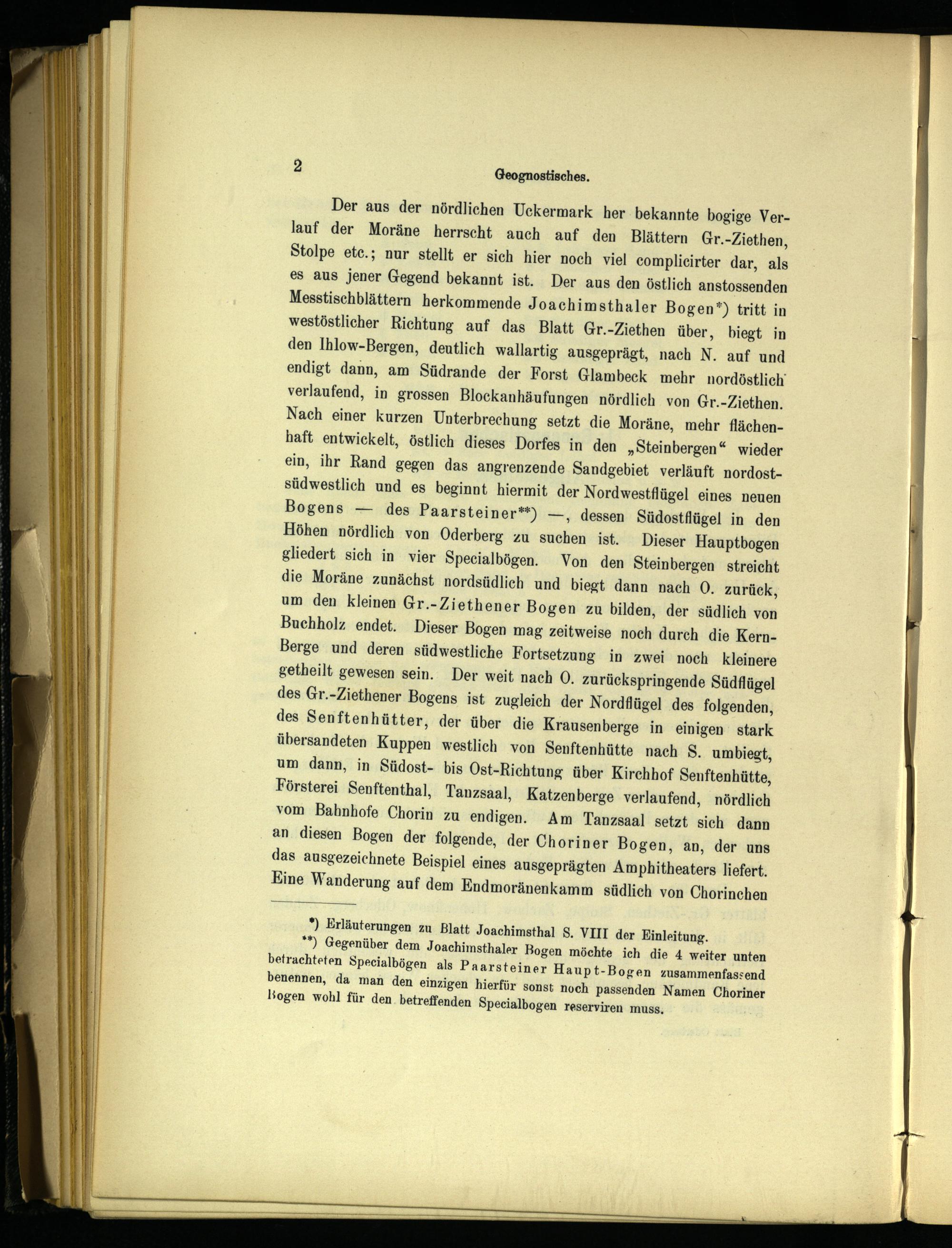 Der aus der nördlichen Uckermark her bekannte bogige Verlauf der Moräne herrscht auch auf den Blättern Gr.-Ziethen, Stolpe ete.; nur stellt er sich hier noch viel complicirter dar, als es aus jener Gegend bekannt ist. Der aus den östlich anstossenden Messtischblättern herkommende Joachimsthaler Bogen*) tritt in westöstlicher Richtung auf das Blatt Gr.-Ziethen über, biegt in den Ihlow -Bergen, deutlich wallartig ausgeprägt, nach N. auf und endigt dann, am Südrande der Forst Glambeck mehr nordöstlich‘ verlaufend, in grossen Blockanhäufungen nördlich von Gr.-Ziethen. Nach einer kurzen Unterbrechung setzt die Moräne, mehr flächenhaft entwickelt, östlich dieses Dorfes in den„Steinbergen “ wieder ein, ihr Rand gegen das angrenzende Sandgebiet verläuft nordostsüdwestlich und es beginnt hiermit der Nordwestflügel eines neuen Bogens— des Paarsteiner**)—, dessen Südostflügel in den Höhen nördlich von Oderberg zu suchen ist. Dieser Hauptbogen gliedert sich in vier Specialbögen. Von den Steinbergen streicht die Moräne zunächst nordsüdlich und biegt dann nach O0. zurück, um den kleinen Gr.-Ziethener Bogen zu bilden, der südlich von Buchholz endet. Dieser Bogen mag zeitweise noch durch die KernBerge und deren südwestliche Fortsetzung in zwei noch kleinere getheilt gewesen sein. Der weit nach 0. zurückspringende Südflügel des Gr.-Ziethener Bogens ist zugleich der Nordflügel des folgenden, des Senftenhütter, der über die Krausenberge in einigen stark übersandeten Kuppen westlich von Senftenhütte nach S. umbiegt, um dann, in Südost- bis Ost-Richtung über Kirchhof Senftenhütte, Försterei Senftenthal, Tanzsaal, Katzenberge verlaufend, nördlich vom Bahnhofe Chorin zu endigen. Am Tanzsaal setzt sich dann an diesen Bogen der folgende, der Choriner Bogen, an, der uns das ausgezeichnete Beispiel eines ausgeprägten Amphitheaters liefert. Eine Wanderung auf dem Endmoränenkamm südlich von Chorinchen