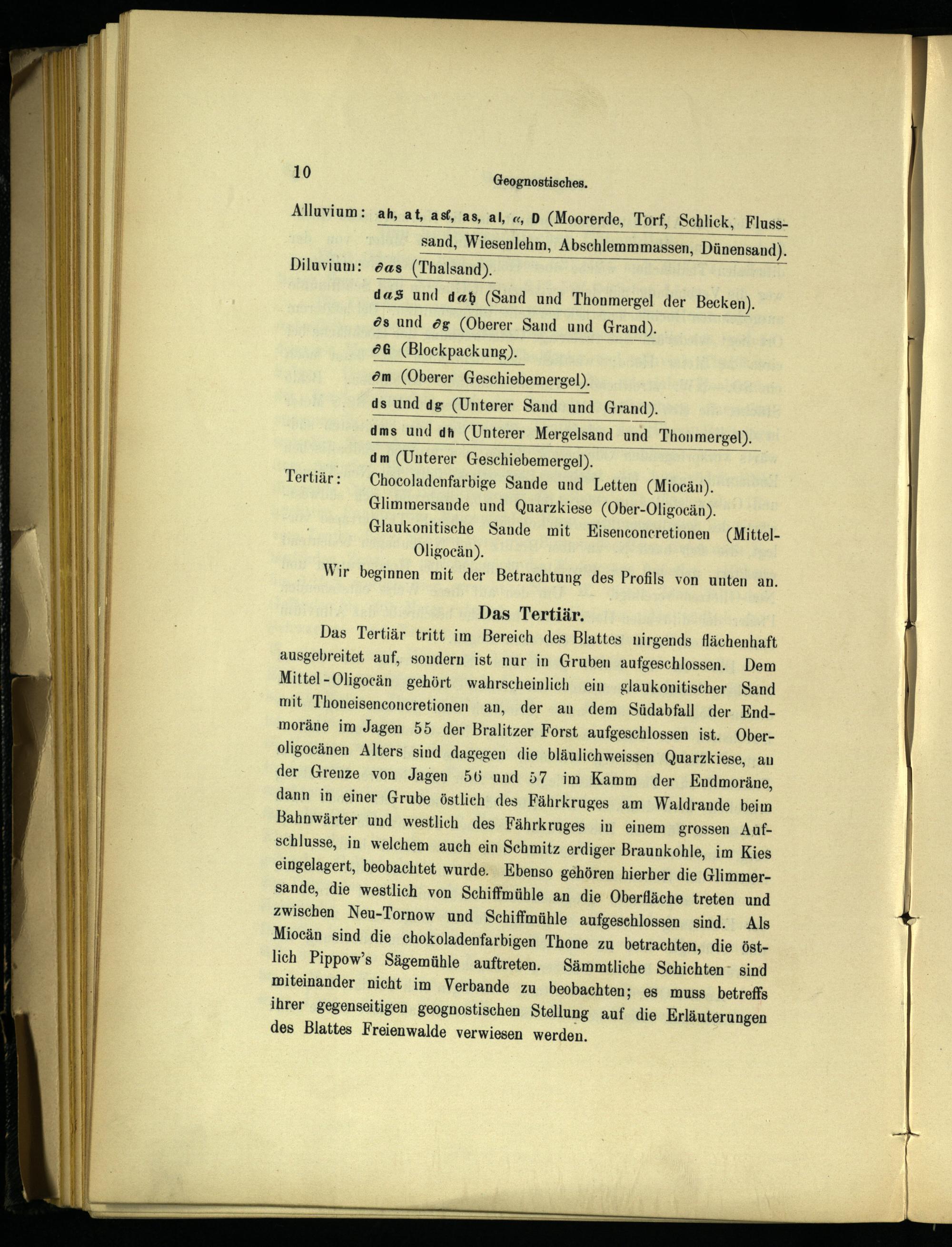 Das Tertiär tritt im Bereich des Blattes nirgends flächenhaft ausgebreitet auf, sondern ist nur in Gruben aufgeschlossen. Dem Mittel- Oligocän gehört wahrscheinlich ein glaukonitischer Sand mit Thoneisenconeretionen an, der an dem Südabfall der Endmoräne im Jagen 55 der Bralitzer Forst aufgeschlossen ist. Oberoligocänen Alters sind dagegen die bläulichweissen Quarzkiese, an der Grenze von Jagen 56 und 57 im Kamm der Endmoräne, dann in einer Grube östlich des Fährkruges am Waldrande beim Bahnwärter und westlich des Fährkruges in einem grossen Aufschlusse, in welchem auch ein Schmitz erdiger Braunkohle, im Kies eingelagert, beobachtet wurde. Ebenso gehören hierher die Glimmersande, die westlich von Schiffmühle an die Oberfläche treten und zwischen Neu-Tornow und Schiffmühle aufgeschlossen sind. Als Miocän sind die Cchokoladenfarbigen Thone zu betrachten, die östlich Pippow’s Sägemühle auftreten. Sämmtliche Schichten“ sind miteinander nicht im Verbande zu beobachten; es muss betreffs ihrer gegenseitigen geognostischen Stellung auf die Erläuterungen des Blattes Freienwalde verwiesen werden.