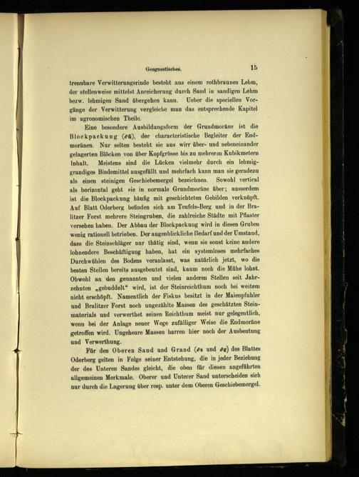 Eine besondere Ausbildungsform der Grundmoräne ist die Blockpackung(66), der characteristische Begleiter der End moränen . Nur selten besteht sie aus wirr über- und nebeneinander gelagerten Blöcken von über Kopfgrösse bis zu mehreren Kubikmetern Inhalt. Meistens sind die Lücken vielmehr durch ein lehmiggrandiges Bindemittel ausgefüllt und mehrfach kann man sie geradezu als einen steinigen Geschiebemergel bezeichnen. Sowohl vertical als horizontal geht sie in normale Grundmoräne über; ausserdem ist die Blockpackung häufig mit geschichteten Gebilden verknüpft. Auf Blatt Oderberg befinden sich am Teufels-Berg und in der Bralitzer Forst mehrere Steingruben, die zahlreiche Städte mit Pflaster versehen haben. Der Abbau der Blockpackung wird in diesen Gruben wenig rationell betrieben. Der augenblickliche Bedarf und der Umstand, dass die Steinschläger nur thätig sind, wenn sie sonst keine andere Johnendere Beschäftigung haben, hat ein systemloses mehrfaches Durchwühlen des Bodens veranlasst, was natürlich jetzt, wo die besten Stellen bereits ausgebeutet sind, kaum noch die Mühe lohnt. Obwohl an. den genannten und vielen anderen Stellen seit Jahrzehnten„gebuddelt“ wird, ist der Steinreichthum noch bei weitem nicht erschöpft. Namentlich der Fiskus besitzt in der Maienpfuhler und Bralitzer Forst noch ungezählte Massen des geschätzten Steinmaterials und verwerthet seinen Reichthum meist nur gelegentlich, wenn bei der Anlage neuer Wege zufälliger Weise die Endmoräne getroffen wird. Ungeheure Massen harren hier noch der Ausbeutung und Verwerthung.