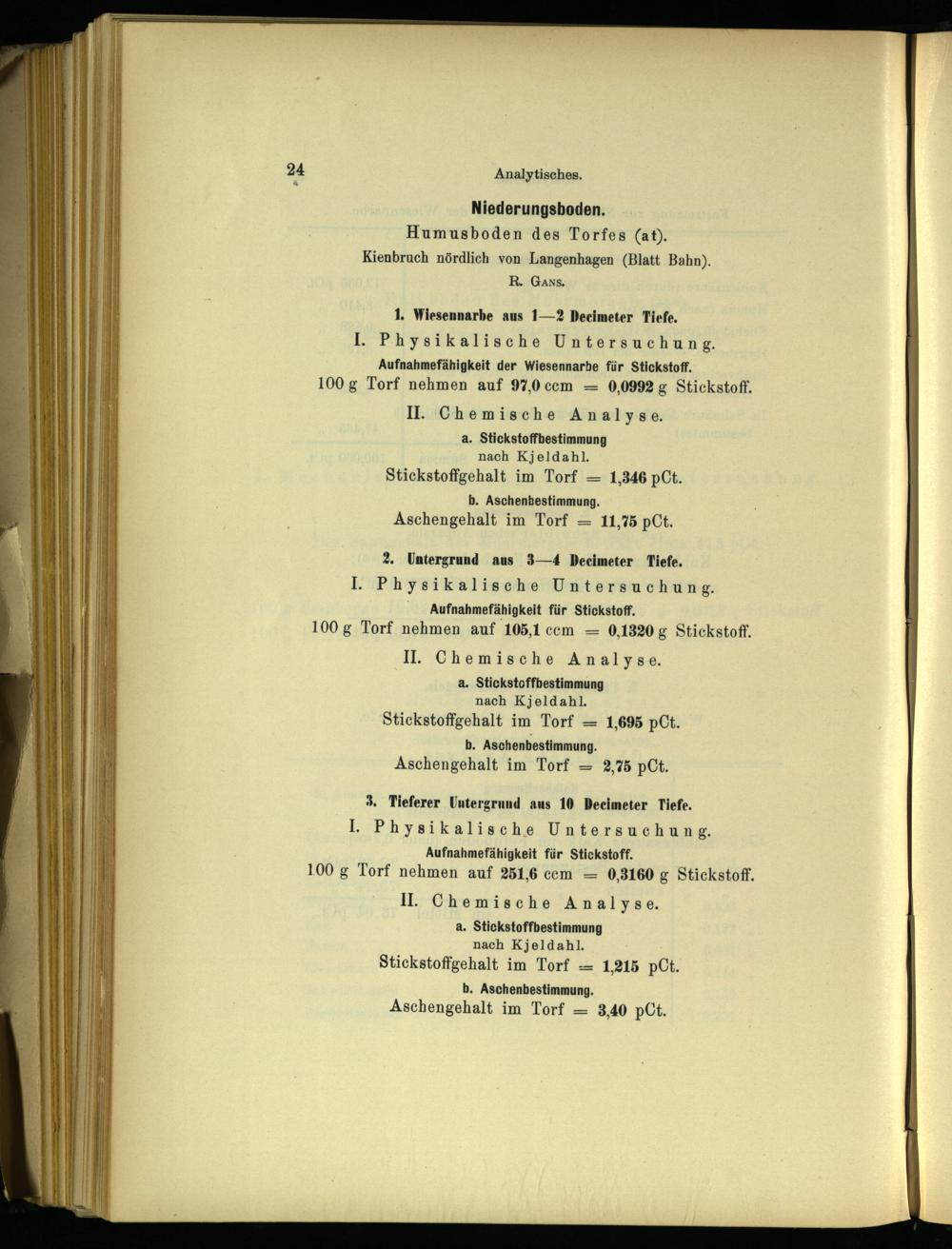a. Stickstoffbestimmung nach Kjeldahl. Stickstoffgehalt im Torf== 1,215 pCt. b. Aschenbestimmung. Aschengehalt im Torf= 3,40 pCt.
