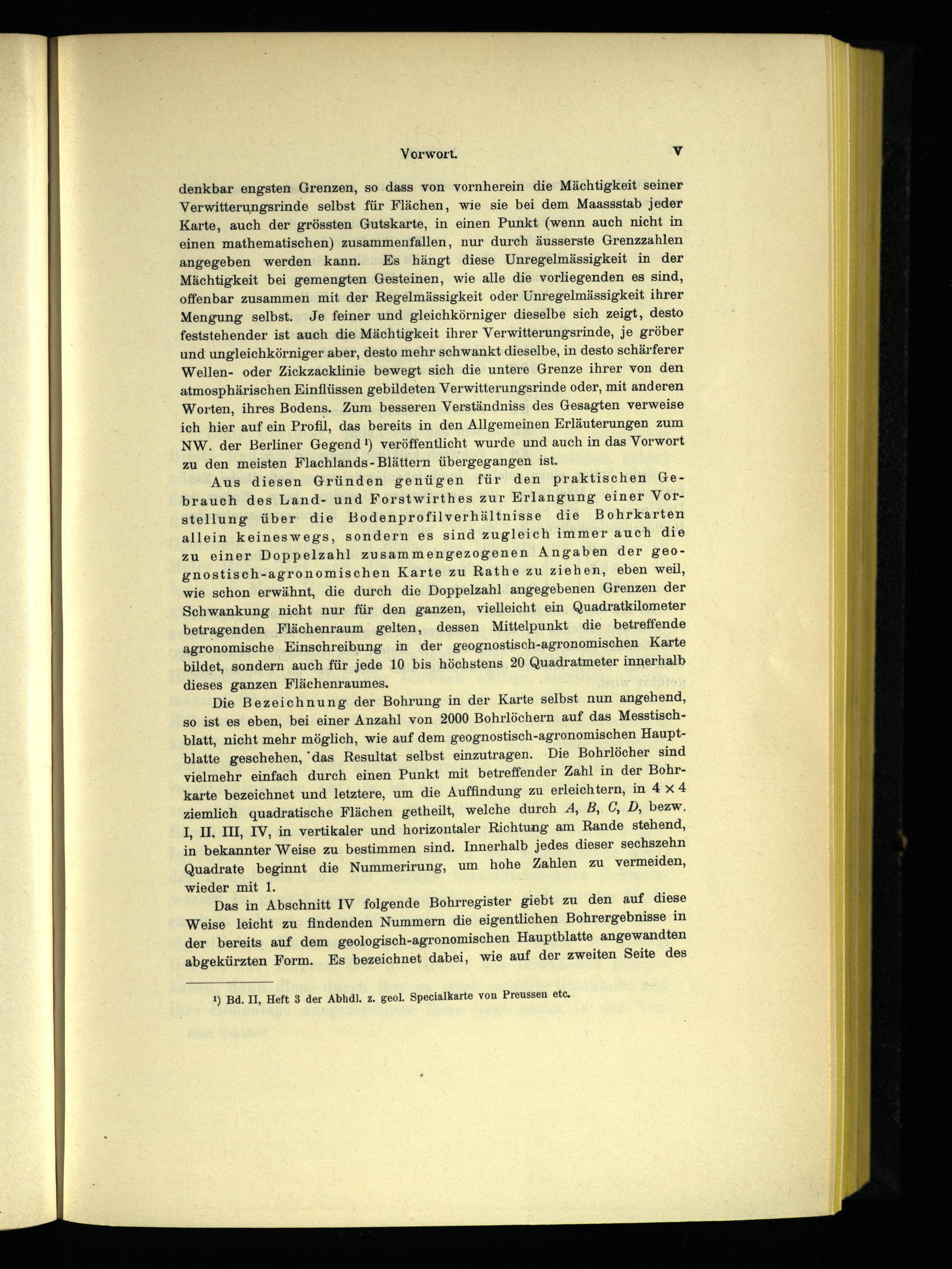 denkbar engsten Grenzen, so dass von vornherein die Mächtigkeit‘ seiner Verwitterungsrinde selbst für Flächen, wie sie bei dem Maassstab jeder Karte, auch der grössten Gutskarte, in einen Punkt(wenn auch nicht in einen mathematischen) zusammenfallen, nur durch äusserste Grenzzahlen angegeben werden kann. Es hängt diese Unregelmässigkeit in der Mächtigkeit bei gemengten Gesteinen, wie alle die vorliegenden es sind, offenbar zusammen mit der Regelmässigkeit oder Unregelmässigkeit ihrer Mengung selbst. Je feiner und gleichkörniger dieselbe sich zeigt, desto feststehender ist‘ auch die Mächtigkeit ihrer Verwitterungsrinde, je gröber und ungleichkörniger aber, desto mehr schwankt dieselbe, in desto schärferer Wellen- oder Zickzacklinie bewegt sich die untere Grenze ihrer von den atmosphärischen Einflüssen gebildeten Verwitterungsrinde oder, mit anderen Worten, ihres Bodens. Zum besseren Verständniss des Gesagten verweise ich hier auf ein Profil, das bereits in den Allgemeinen Erläuterungen zum NW. der Berliner Gegend!) veröffentlicht wurde und auch in das Vorwort zu den meisten Flachlands- Blättern übergegangen ist.