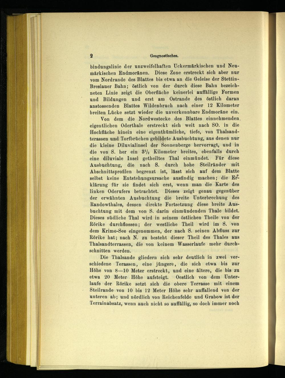 bindungslinie der unzweifelhaften Uckermärkischen und Neumärkischen Endmoränen . Diese Zone erstreckt sich aber nur vom Nordrande des Blattes bis etwa an die Geleise der StettinBreslauer Bahn; östlich von der durch diese Bahn bezeichneten Linie zeigt die Oberfläche keinerlei auffällige Formen und Bildungen und erst am Ostrande des östlich daran anstossenden Blattes Wildenbruch nach einer 12 Kilometer breiten Lücke setzt wieder die unverkennbare Endmoräne ein.