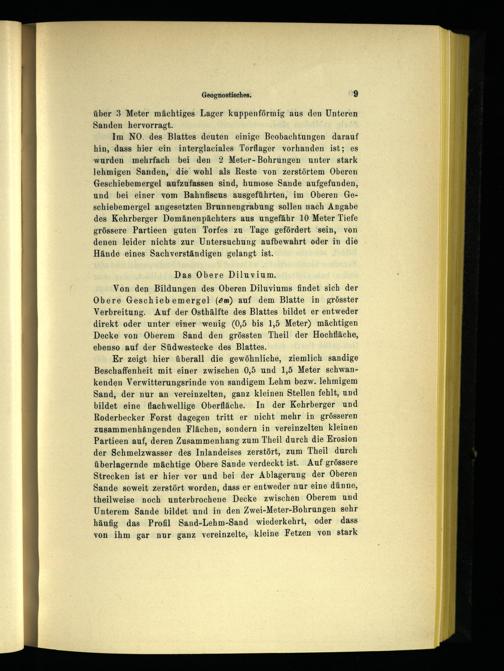 Von den Bildungen des Oberen Diluviums findet sich der Obere Geschiebemergel(öm) auf dem Blatte in grösster Verbreitung. Auf der Osthälfte des Blattes bildet er entweder direkt oder unter einer wenig(0,5 bis 1,5 Meter) mächtigen Decke von Oberem Sand den grössten Theil der Hochfläche,