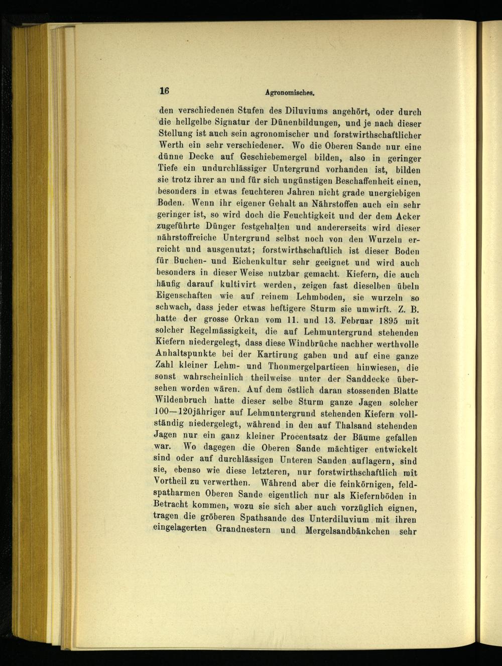 den verschiedenen Stufen des Diluviums angehört, oder durch die hellgelbe Signatur der Dünenbildungen, und je nach dieser Stellung ist auch sein agronomischer und forstwirthschaftlicher Werth ein sehr verschiedener. Wo die Oberen Sande nur. eine dünne Decke auf Geschiebemergel bilden, also in geringer Tiefe ein undurchlässiger Untergrund vorhanden ist, bilden sie trotz ihrer an und für sich ungünstigen Beschaffenheit einen, besonders in etwas feuchteren Jahren nicht grade unergiebigen Boden. Wenn ihr eigener Gehalt an Nährstoffen auch ein sehr geringer ist, so wird doch die Feuchtigkeit und der dem Acker zugeführte Dünger festgehalten und andererseits wird dieser nährstoffreiche Untergrund selbst noch von den Wurzeln erreicht und ausgenutzt; forstwirthschaftlich ist dieser Boden für Buchen- und Eichenkultur sehr geeignet und wird auch besonders in dieser Weise nutzbar gemacht. Kiefern, die auch häufig darauf kultivirt werden, zeigen fast dieselben übeln Eigenschaften wie auf reinem Lehmboden, sie wurzeln‘so schwach, dass jeder etwas heftigere Sturm sie umwirft. Z. B. hatte der grosse Orkan vom 11. und 13. Februar 1895 mit solcher Regelmässigkeit, die auf Lehmuntergrund stehenden Kiefern niedergelegt, dass diese Windbrüche nachher werthvolle Anhaltspunkte bei der Kartirung gaben und auf eine ganze Zahl kleiner Lehm- und Thonmergelpartieen hinwiesen, die sonst wahrscheinlich theilweise unter der Sanddecke übersehen worden wären. Auf dem östlich daran stossenden Blatte Wildenbruch hatte dieser selbe Sturm ganze Jagen solcher 100—120jähriger auf Lehmuntergrund stehenden Kiefern vollständig niedergelegt, während in den auf Thalsand stehenden Jagen nur ein ganz kleiner Procentsatz der Bäume gefallen war. Wo dagegen die Oberen Sande mächtiger entwickelt sind oder auf durchlässigen Unteren Sanden auflagern, sind sie, ebenso wie diese letzteren, nur forstwirthschaftlich mit Vortheil zu verwerthen. Während aber die feinkörnigen, feldspatharmen Oberen Sande eigentlich nur als Kiefernböden in Betracht kommen, wozu sie sich aber auch vorzüglich eignen, tragen die gröberen Spathsande des Unterdiluvium mit ihren eingelagerten Grandnestern und Mergelsandbänkchen sehr