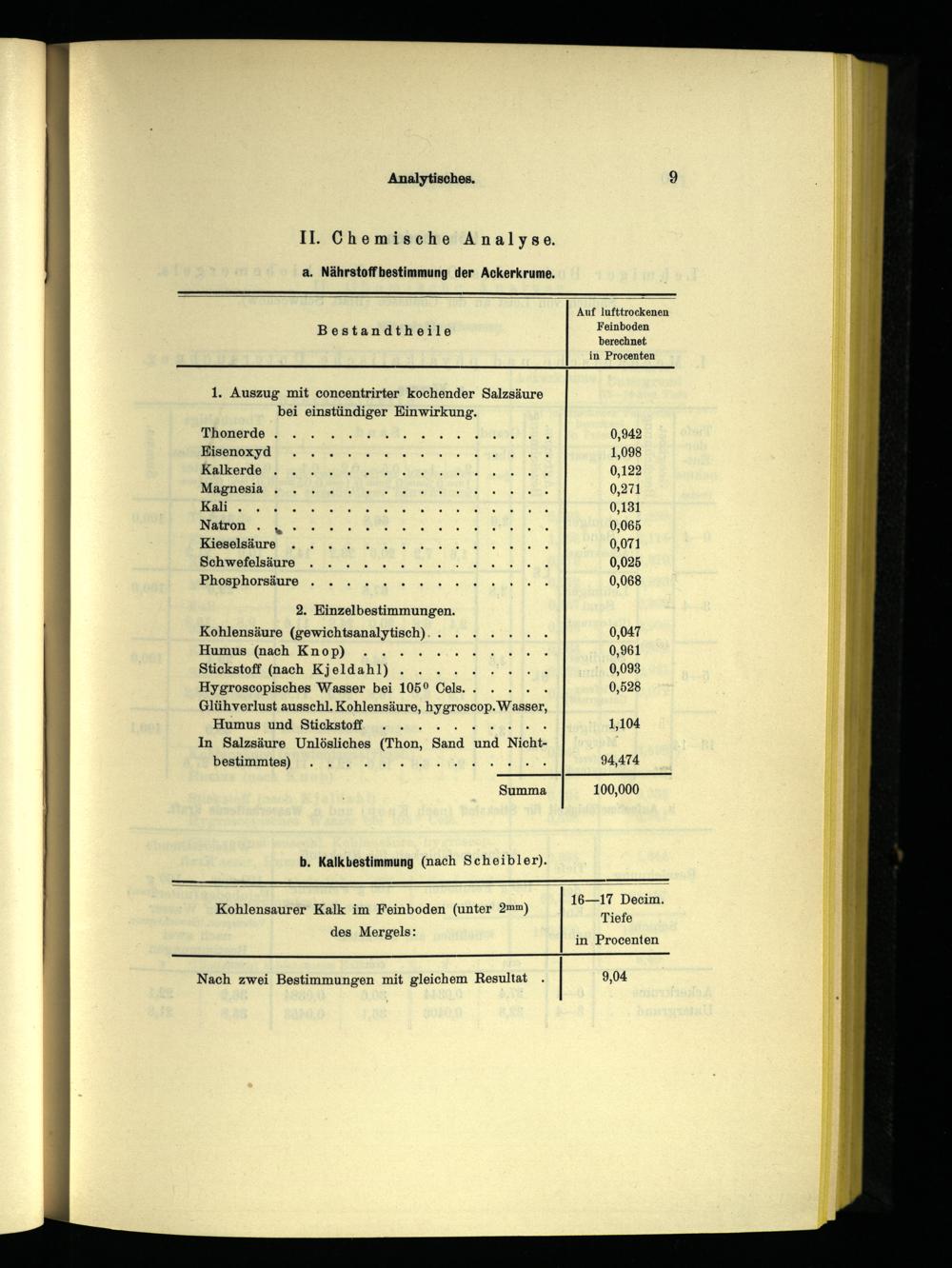 Kohlensäure(gewichtsanalytisch)........ 0,047 Humus(nach Knop)...... 0... 0,961 Stickstoff(nach Kjeldahl)......... 0,093 Hygroscopisches Wasser bei 105° Cels...... 0,528 Glühverlust ausschl. Kohlensäure, hygroscop. Wasser,