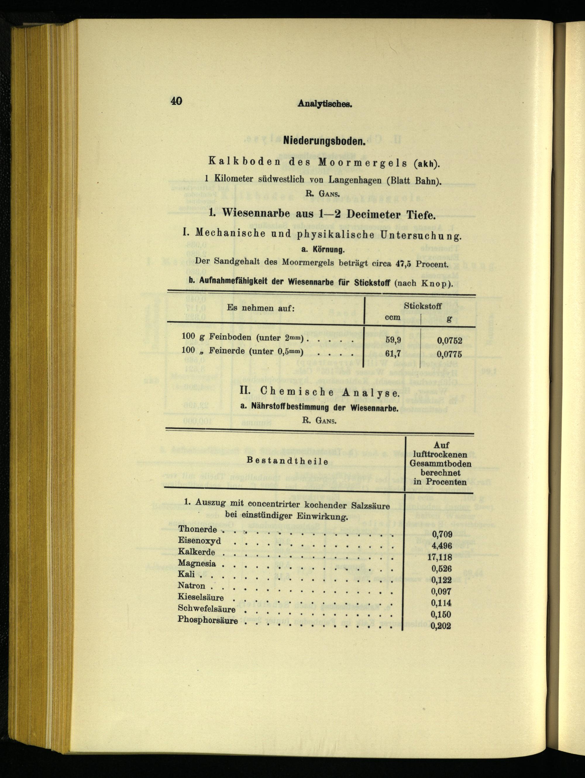 I. Mechanische und physikalische Untersuchun e: a. Körnung. Der Sandgehalt des Moormergels beträgt circa 47,5 Procent. b. Aufnahmefähigkeit der Wiesennarbe für Stickstoff(nach Knop). m Es nehmen auf: Stickstoff