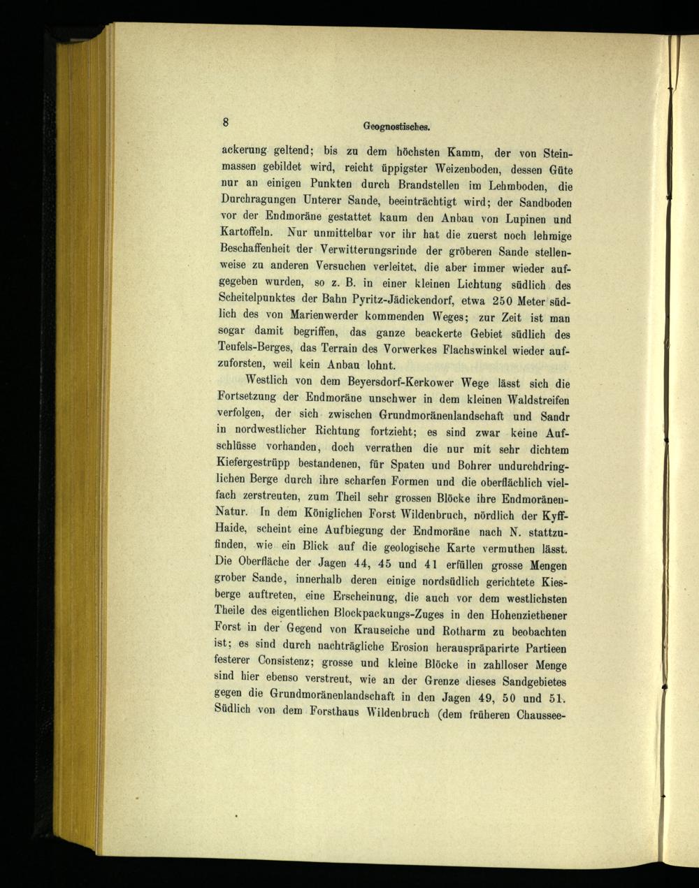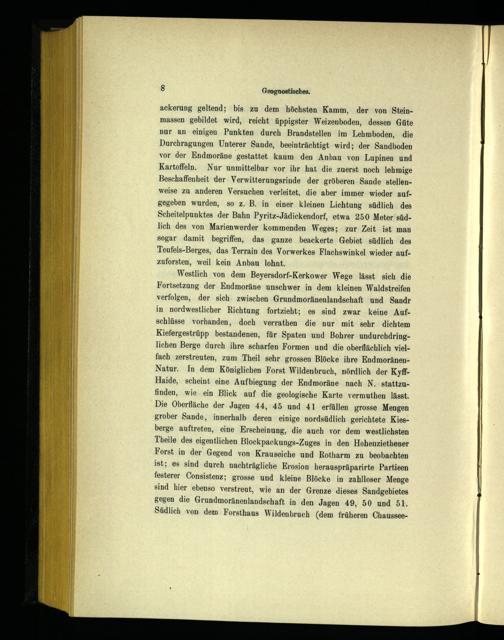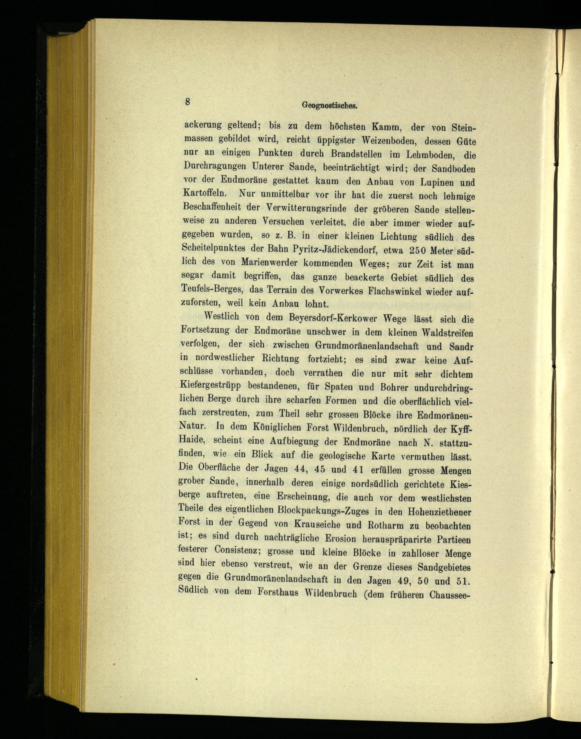 Westlich von dem Beyersdorf-Kerkower Wege lässt sich die Fortsetzung der Endmoräne unschwer in dem kleinen Waldstreifen verfolgen, der sich. zwischen Grundmoränenlandschaft und Sandr in nordwestlicher Richtung fortzieht; es sind zwar ‚keine Aufschlüsse vorhanden, doch verrathen die nur mit sehr dichtem Kiefergestrüpp bestandenen, für Spaten und Bohrer undurchdringlichen Berge durch ihre scharfen Formen und die oberflächlich vielfach zerstreuten, zum Theil sehr grossen Blöcke ihre EndmoränenNatur. In dem Königlichen Forst Wildenbruch, nördlich der KyffHaide, scheint eine Aufbiegung der Endmoräne nach N. stattzufinden, ‚wie ein Blick auf die geologische Karte vermuthen lässt. Die Oberfläche der Jagen 44, 45 und 41 erfüllen grosse Mengen grober Sande, innerhalb deren einige nordsüdlich gerichtete Kiesberge auftreten, eine Erscheinung, die auch vor dem westlichsten Theile des eigentlichen Blockpackungs-Zuges in den Hohenziethener Forst in der Gegend von Krauseiche und Rotharm zu beobachten ist; es sind durch nachträgliche Erosion herauspräparirte Partieen festerer Consistenz; grosse und kleine Blöcke in zahlloser Menge sind hier ebenso verstreut, wie an der Grenze dieses Sandgebietes gegen die Grundmoränenlandschaft in den Jagen 49, 50 und 51. Südlich von. dem. Forsthaus Wildenbruch(dem früheren Chaussee