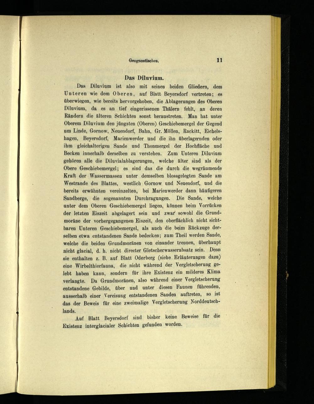 Das Diluvium ist also mit seinen beiden Gliedern, dem Unteren wie dem Oberen, auf Blatt Beyersdorf vertreten; es überwiegen, wie bereits hervorgehoben, die Ablagerungen des Oberen Diluvium, da es an tief eingerissenen Thälern fehlt, an deren Rändern die älteren Schichten sonst. heraustreten.. Man hat unter Oberem Diluvium den jüngsten(Oberen) Geschiebemergel der Gegend um Linde, Gornow, Neuendorf, Bahn, Gr. Möllen, Rackitt, Eichelshagen, Beyersdorf, Marienwerder und die ihn. überlagernden oder ihm gleichalterigen Sande und Thonmergel der Hochfläche und Becken innerhalb derselben zu verstehen. Zum Unteren Diluvium gehören alle die Diluvialablagerungen, welche älter sind als der Obere Geschiebemergel; es sind das die durch die wegräumende Kraft der Wassermassen unter demselben blossgelegten Sande am Westrande des Blattes, westlich Gornow und Neuendorf, und die bereits erwähnten vereinzelten, bei Marienwerder dann häufigeren Sandberge, die sogenannten Durchragungen. Die Sande, welche unter dem Oberen Geschiebemergel liegen, können beim Vorrücken der letzten Eiszeit abgelagert sein und zwar‘ sowohl die Grundmoräne der vorhergegangenen Eiszeit, den oberflächlich nicht sichtbaren Unteren Geschiebemergel, als auch die beim Rückzuge derselben etwa entstandenen Sande bedecken; zum Theil werden Sande, welche die beiden Grundmoränen von einander trennen, überhaupt nicht glacial, d. h. nicht directer Gletscherwasserabsatz sein. Denn sie enthalten z. B. auf Blatt Oderberg (siehe, Erläuterungen dazu) eine Wirbelthierfauna, die nicht während der Vergletscherung gelebt haben kann, sondern für ihre Existenz ein milderes Klima verlangte. Da Grundmoränen, also während einer Vergletscherung entstandene Gebilde, über und unter diesen Faunen führenden, ausserhalb einer Vereisung entstandenen Sanden auftreten, so ist das der Beweis für eine zweimalige Vergletscherung Norddeutschlands.